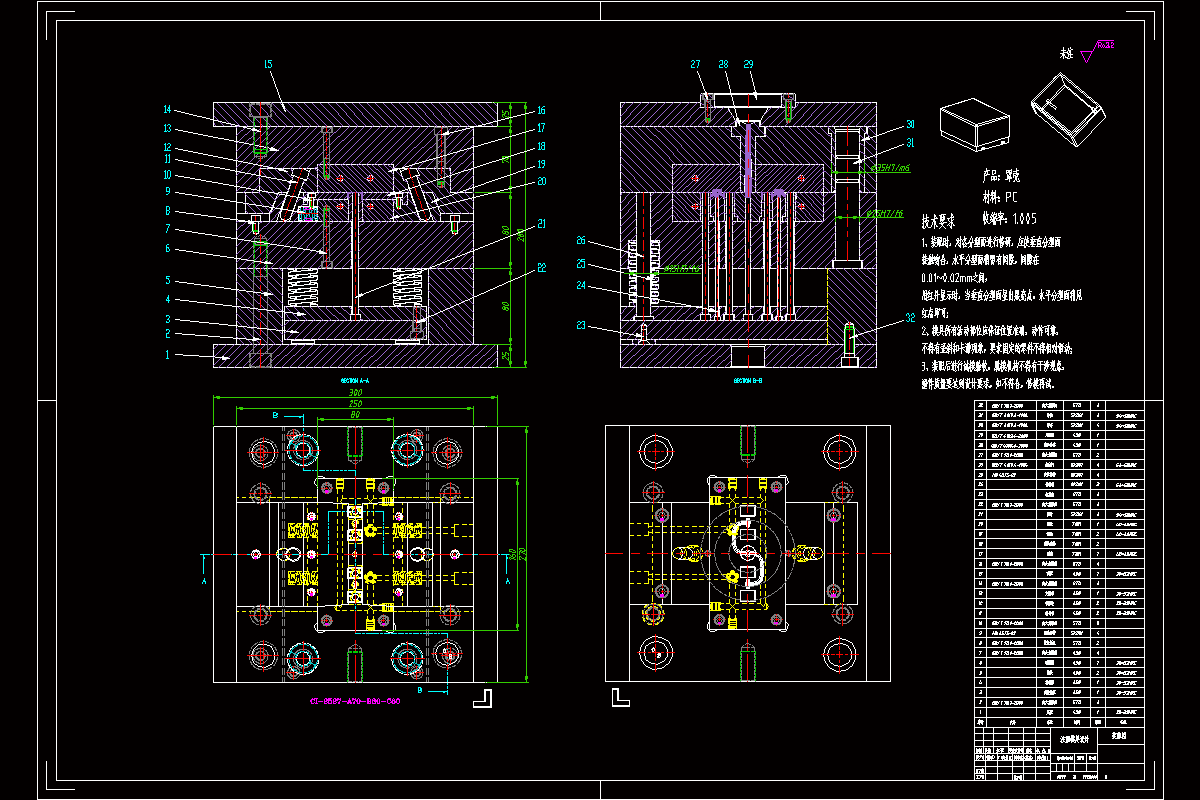 此次是针对罩壳塑件的整体详细的模具设计过程。采用PC增强10%进行注塑生产,模具结构采用一模四腔的结构形式,整个过程包括对塑件的结构分析,注塑机的选定,模具浇注系统及冷却系统的设计,模腔零件和运动机构等重要尺寸的校核与设计。在注塑过程中如果想获得尺寸上的精度、塑胶件的外观、性能等等以上方面都可以满足使用要求的塑件图,在对模具制作各方面都需要要求做到,从而满足要求。从模具加工方面来看,需要加工简单,制造及维修成本低;从模具使用角度来看,要操作方便,结实耐用,以及后续维修简便。所以在模具设计时,要综合到各方面的因素与考虑,最终拟定一个合理的设计方案。