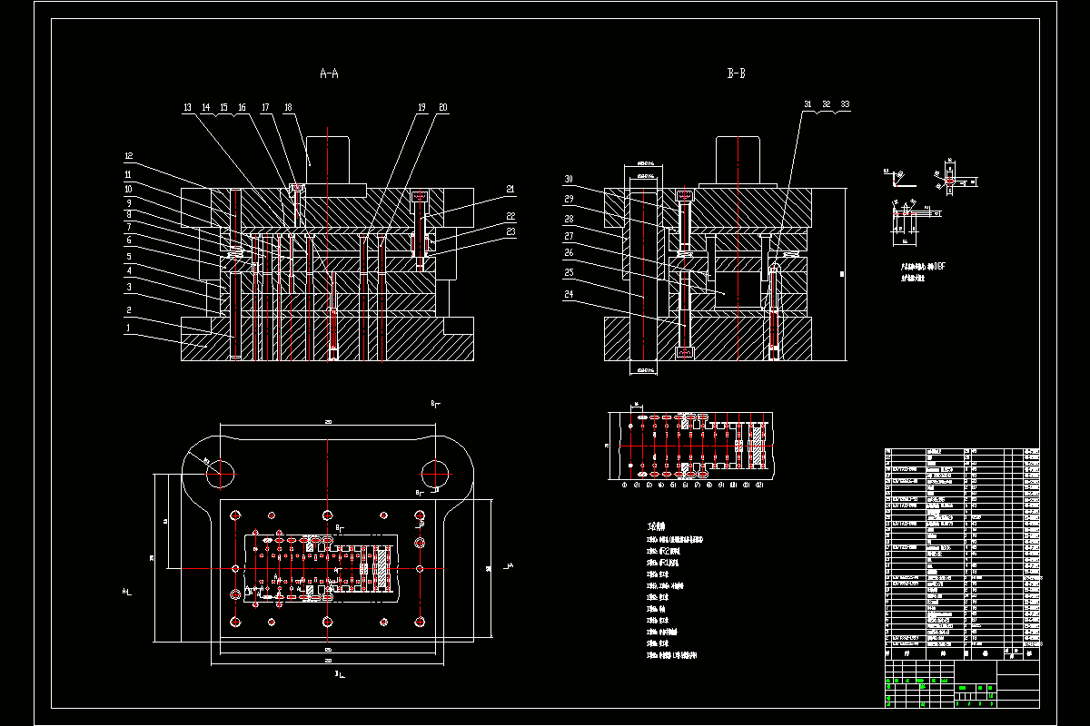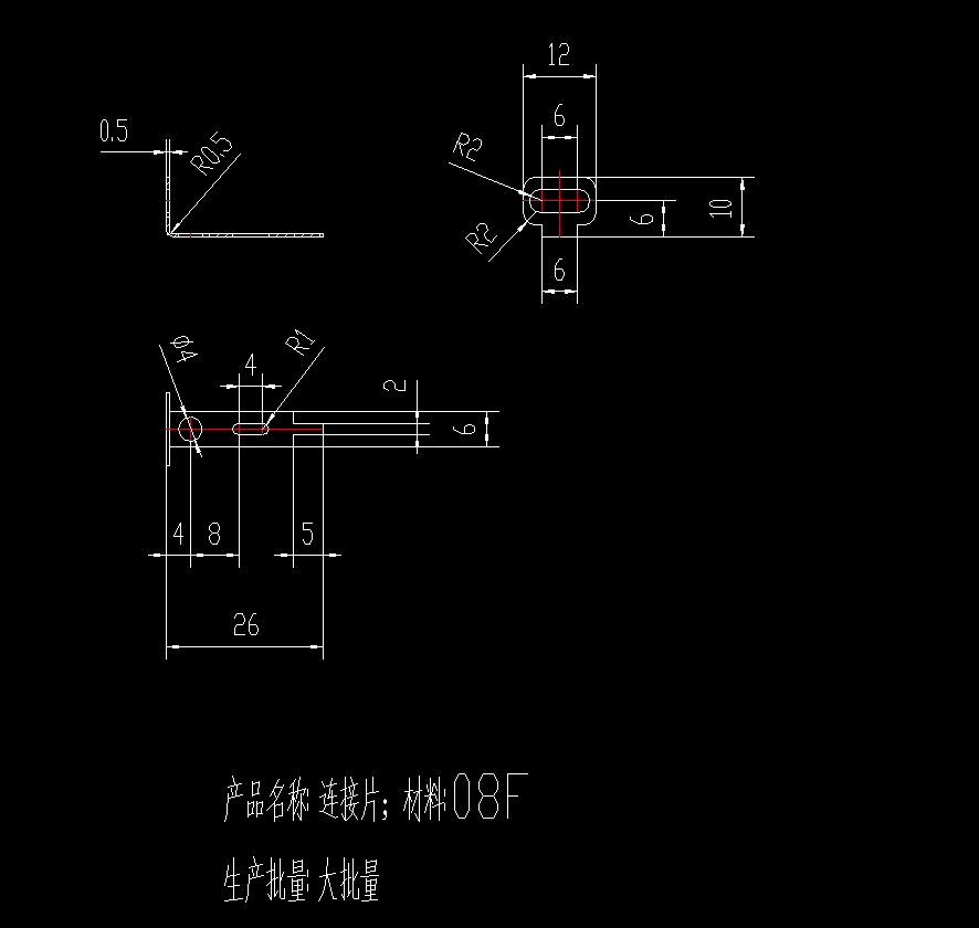 连接片模具设计时,首先要设计正式装配图,再绘制每个零件图。绘制装配图,在装配图中,要确定模具所使用的模架形式(包括导向系统),卸料结构,导料装置,送料和步距方式,凸、凹模的结构形式及固定方法等。对模具零件图一般是指非标准件或采用标准件需要局部加工的地方,这些零件均需绘制,模具零件图视图的多少,以能看明白图形为标准。由于多工位级进模结构复杂,因此设计完图样后应附有一份简明的说明书,包括选用冲床、模具闭合高度、模柄直径、轮廓尺寸、规定行程范围、每分钟冲压次数、选用自动送料机构的型号、送料步距和步距公差等,还要说明安装调整要点。在说明书中要明确模具刃磨和维修的注意事项,如哪些凸模、凹模镶件要拆下刃磨,在刃磨后需调整的各工作部分的相对高度值等。要有易损件、备件明细表等。模具完成后,装配图和零件图都要编号并必须进行校核,校核工作很重要,它对减少差错,提高质量是有益的。