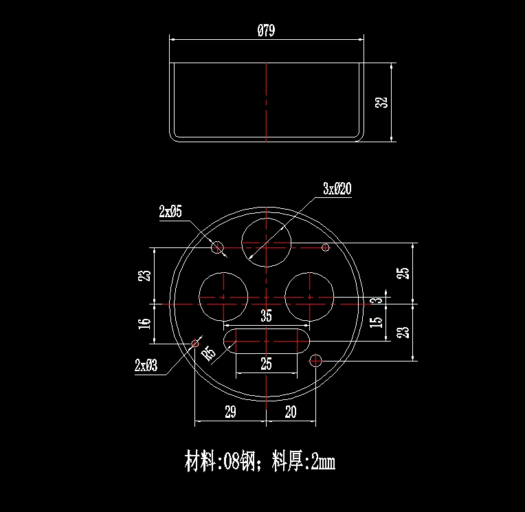 圆筒材料08钢,未注尺寸公差IT14,要求不高,料厚为2mm,圆筒外形尺寸Ф79mm,高度32mm,模具采用后侧导柱模架,缷料采用刚性结构。在冲压设计中,材料费用占60%以上,故材料利用率越高,圆筒的成本越低。