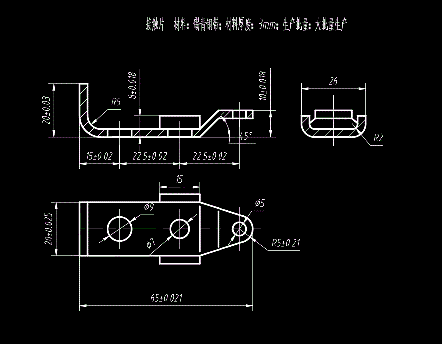 本文是对尺寸一般,精度要求相对较高,工艺比较复杂,生产批量大的接触片的多工位级进模设计。在对接触片多工位级进模设计结构工艺性和材料加工工艺性正确分析的基础上,采用叙述与计算相结合的方式,分别对级进模的冲孔、切口等工序进行了从材料的选择到工作零件、定位零件、卸料零件、导向零件和安装固定零件等进行了设计。在所有的工序中,弯曲工序的凸、凹模结构设计是难点,本文提出了在级进模的加工的新思路,讨论了思路的可行性,并对其进行了整体和局部的结构设计。这种设计的思路有着良好的借鉴性。在这次设计中,选用了级进模具,将以往简单分散低效率的冲压转变为一次加工成型的自动生产过程,从而使得劳动生产率大幅度提到。对以往的学习进行了一次综合性的运用,对今后的工作也有相当大的指导意义。