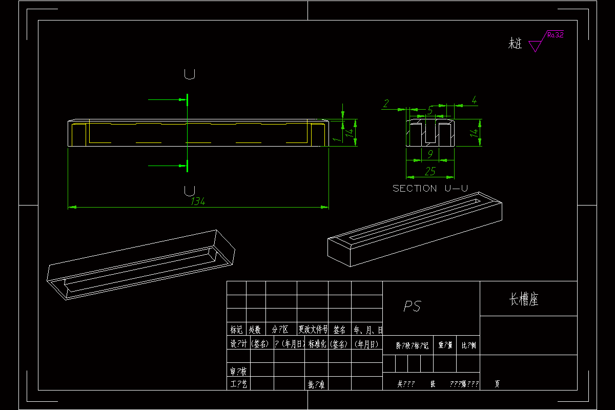 本次设计的参考件是以长槽座为设计任务,此产品外形光滑简单,用UG三维软件绘制产品。在绘制过程中要考虑到抜模斜度,方便顶出脱模。绘制完成后,根据需求排列出一模二腔计算出他的模架,然后确定它的分型面。分型面的选择也要考虑到脱模的方向和零件的外形,还要考虑到型芯型腔的机械加工方便性和顶出机构的受力均匀。根据产品的排列和原料的流动性收缩率选择进料口使其填面不缺料。冷却方法根据模具的设计产品的摆放来确定,一般采用环绕式的水管。推出机构通常采用圆顶针,这种推模方式会留有顶出痕迹,如不能有顶出痕迹可使用推板推出或者使用机型手取出,选用的方式根据产品的使用和外观要求而定。三维软件绘制完成后根据图形再使用CAD绘制二维装配图和零件图,这样绘制二维装配图时思路清晰不容易出错。在设计过程中需考虑到模具在机械加工方面的制造工艺,还有就是在制造完成后模具使用的安全设备维修的方便跟换宜受损部分的简便,这都是在设计过程不可缺少的。