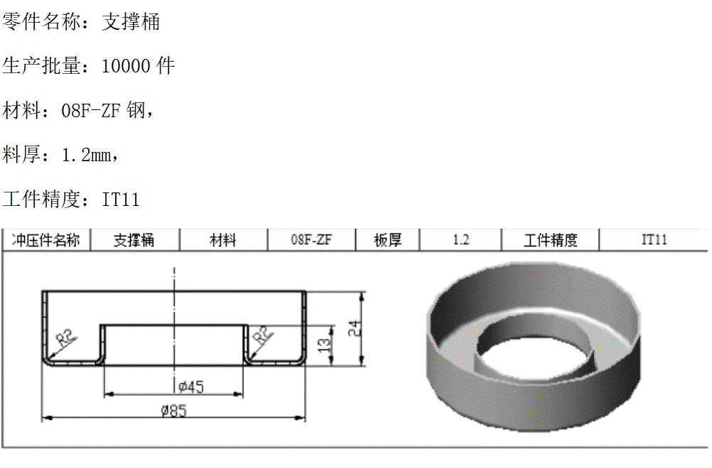 根据任务书的要求,本次设计的工件为支撑桶,初步分析该工件的结构,可以看出该工件为圆筒型的拉深件,并且不带有凸缘,属于无凸缘拉深件,在整个工件的内部和表面有冲孔和翻孔,所以我们可以分析出该工件所需要的工序有落料,拉深,冲孔以及翻孔四个工序。在下文的叙述中,我将会首先对工件的工艺性进行分析,然后对拉深件的毛坯尺寸进行展开尺寸的计算,利用展开的毛坯尺寸进行排样图计算,算出材料利用率,然后对模具的冲裁方案进行选择,选择使用复合模或者级进模或者单工序模具进行设计。因为本次设计工序有落料,拉深,冲孔,翻孔四个工序,所以模具所需的冲压力有落料冲孔工序的冲裁力和拉深翻边工序的成形力,求和即为整套模具的冲压力,然后根据这个冲压力选择合适的相匹配的压力机,并且进行校核,然后又对冲裁和拉深的刃口尺寸进行了计算后,设计出了其余零部件,最后进行了整理和绘制装配图。