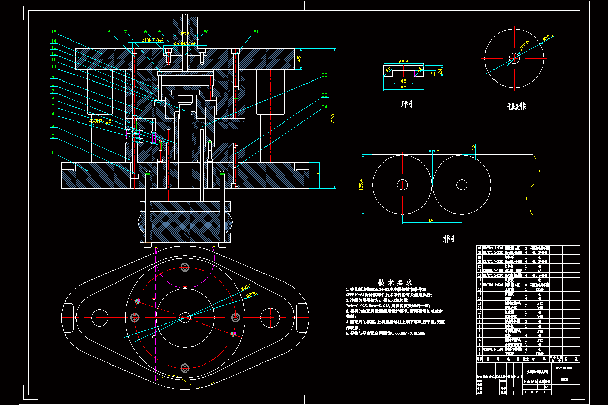 本次设计的难点在于拉深模具的计算,拉深工件的计算比较复杂,在进行设计模具之前需要对拉深次数进行计算,如果工件能够一次拉深成型,那么最优的方案即为复合模,一套落料拉深冲孔翻孔复合模即可成形,如果一次拉深工序不能够成形工件,那么即需要两套模具。选用合适的模架形式也是影响工件成品质量的关键,常用的模架形式有中间导柱模架,后侧导柱模架以及对角导柱模架等等。
