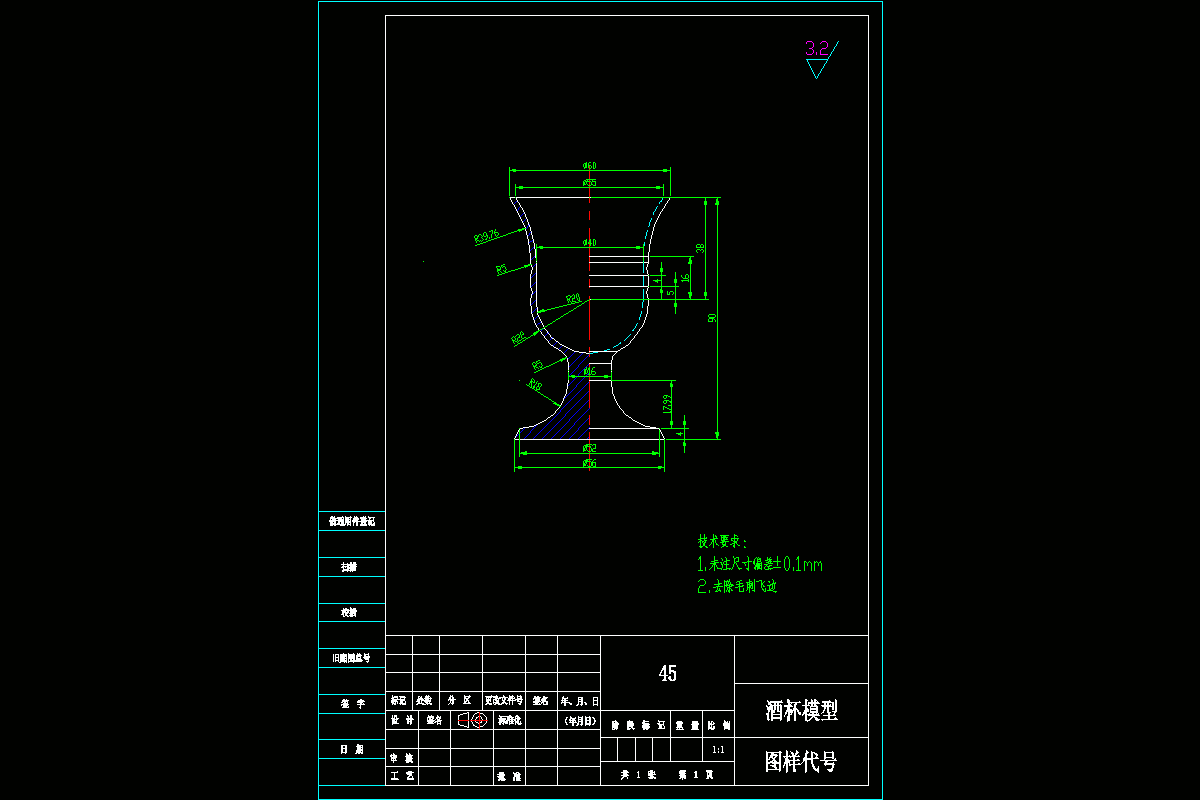 数控加工的速度很快,质量能很好的得到保证,所以当今社会对数控技术加工用得越来越多啊,通过我在学校这几年阶段不断对数控加工进行接触,让我越来越了解数控加工的好处。文章是对结构比较复杂的酒杯模型零件,对工件进行工艺的分析、选择加工的毛坯尺寸、加工用的机床,在分析的时候一直去改进酒杯模型零件的加工工艺。然后进行画CAD图,再对零件来完成程序的编制,编程完好后用软件中的仿真加工对程序进行加工仿真,保证加工程序正确。