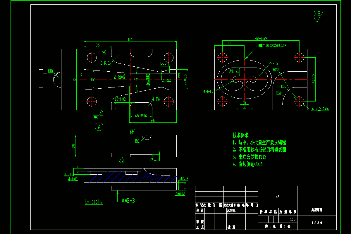 本次设计任务是对零件的加工工艺设计与CAM,使用CAD制图软件将零件的二维图形画出来,再用UG软件画出三维图纸。接着对零件结构、精度、技术要求进行分析。设计加工零件的数控工艺方案,选择毛坯材料及大孝加工用的刀具、加工机床,以及合理的切削参数等。选择出最佳的加工工艺方案,然后使用UG中的CAM模块对零件的数控加工程序进行编制,完成本次设计。