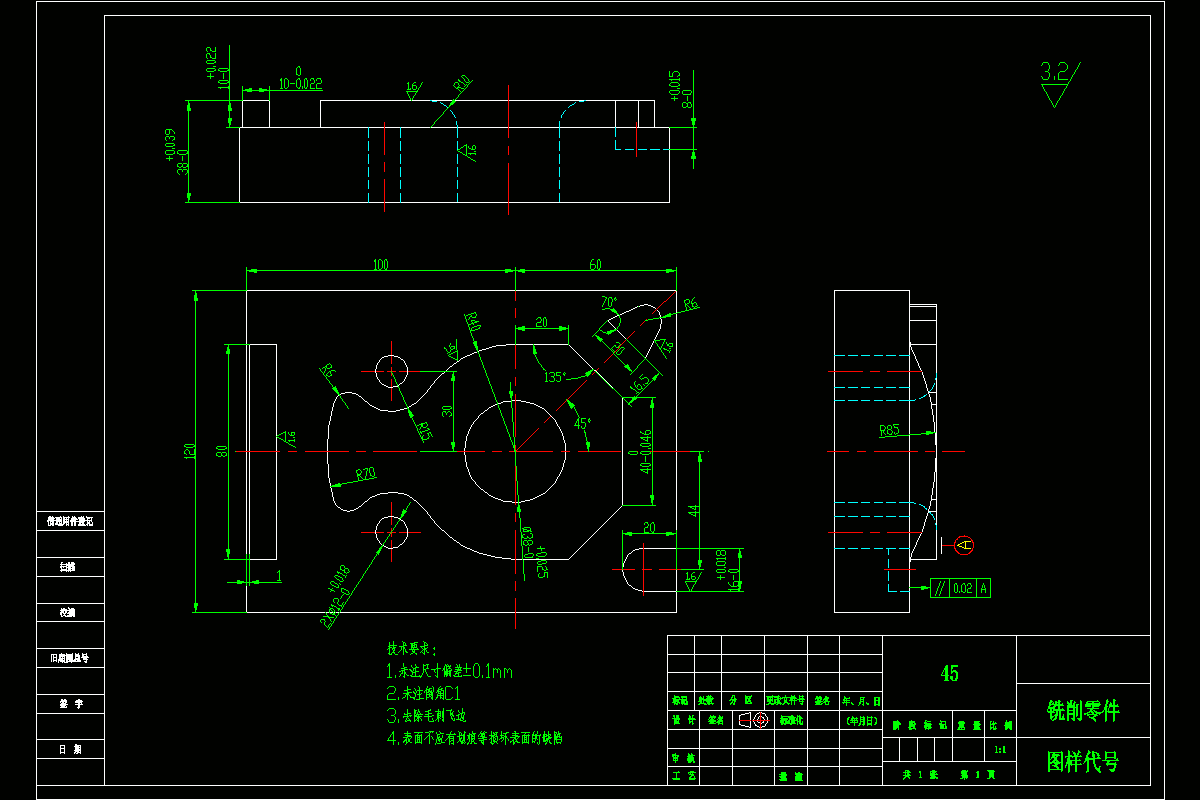 本次设计任务是对零件的加工工艺设计与CAM,使用CAD制图软件将零件的二维图形画出来,再用UG软件画出三维图纸。接着对零件结构、精度、技术要求进行分析。设计加工零件的数控工艺方案,选择毛坯材料及大孝加工用的刀具、加工机床,以及合理的切削参数等。选择出最佳的加工工艺方案,然后使用UG中的CAM模块对零件的数控加工程序进行编制,完成本次设计。