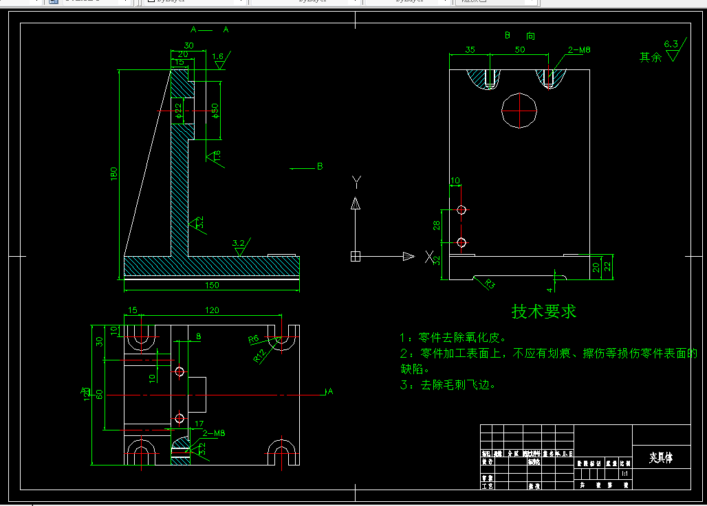 支架加工工艺规程及其钻孔的夹具设计是包括零件加工的工艺设计、工序设计以及专用夹具的设计三部分。在工艺设计中要首先对零件进行分析,了解零件的工艺再设计出毛坯的结构,并选择好零件的加工基准,设计出零件的工艺路线;接着对零件各个工步的工序进行尺寸计算,关键是决定出各个工序的工艺装备及切削用量;然后进行专用夹具的设计,选择设计出夹具的各个组成部件,如定位元件、夹紧元件、引导元件、夹具体与机床的连接部件以及其它部件;计算出夹具定位时产生的定位误差,分析夹具结构的合理性与不足之处,并在以后设计中注意改进。