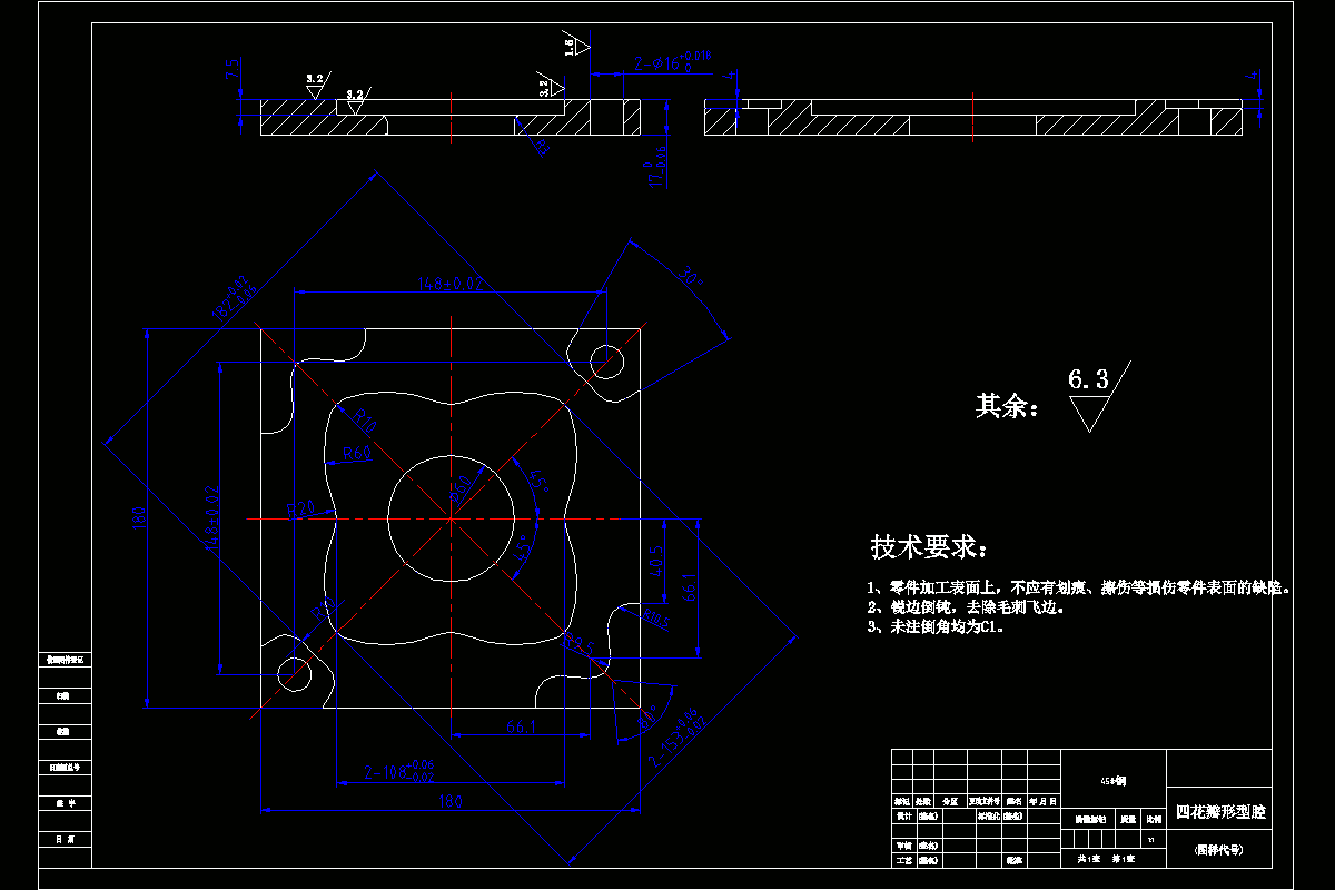 本课题来源于生产,是对所学知识的应用,它包括了我们在校几年所学的全部知识,在数控专业上具有代表性,而且提高了综合运用各方面知识的能力。程序的编制到程序的调试,零件的加工运用到了所学的AutoCAD、MC软件、机床操作、刀具的选择、零件的工艺分析、工艺路线等一系列的内容。这将所学到的理论知识充分运用到了实际加工中,切实做到了理论与实践的有机结合,选择正确的加工方法,设计合理的加工工艺过程,充分发挥数控加工的优质、高效、低成本的特点。本文主要对零件进行了,图纸分析、毛坯的选择、加工方法以及加工路线的选择、对刀具机床进行确定,并且选定刀具参数规格,选定机床的型号。然后填写工艺卡片,工序卡片。对零件进行自动编程。