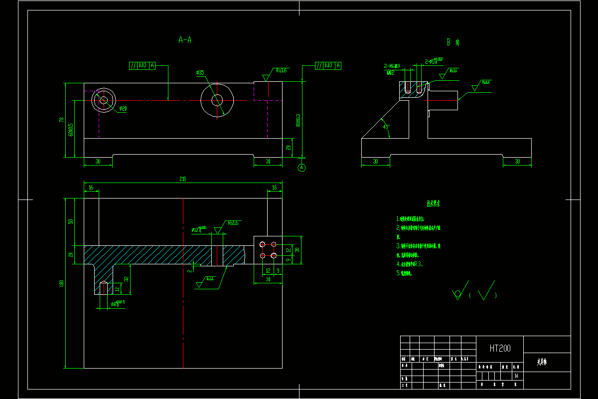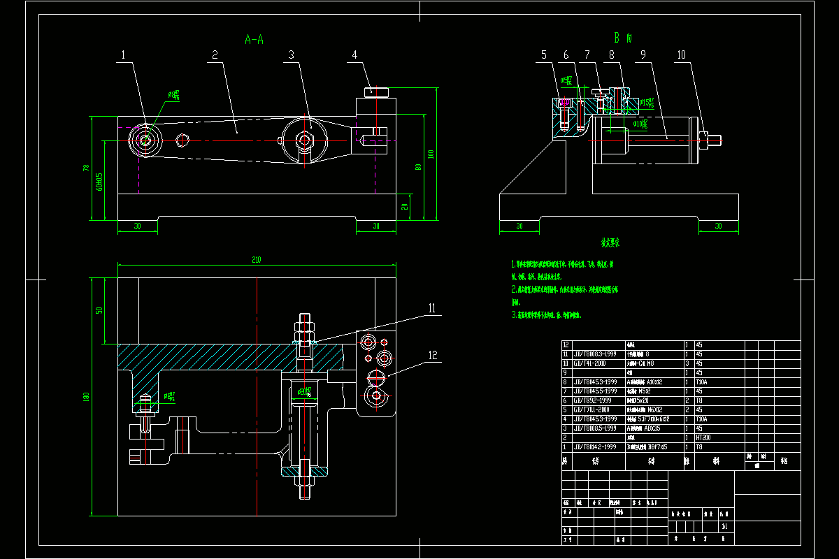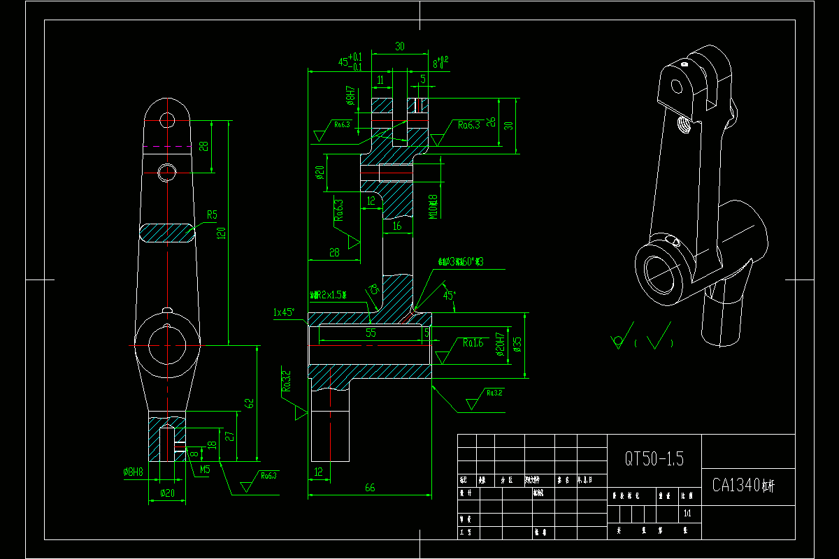 车床杠杆加工工艺规程及其钻、攻M5螺纹的夹具,是包括零件加工的工艺设计、工序设计以及专用夹具设计三部分。在工艺设计中要首先对零件进行分析,了解零件的工艺再设计出毛坯的结构,并选择好零件的加工基准,设计出零件的工艺路线;接着对零件各个工步的工序进行尺寸计算,关键是决定出各个工序的工艺装备及切削用量;然后进行专用夹具的设计,选择设计出夹具的各个组成部件,如定位元件、夹紧元件、引导元件、夹具体与机床的连接部件以及其它部件;计算出夹具定位时产生的定位误差,分析夹具结构的合理性与不足之处,并在以后设计中注意改进。