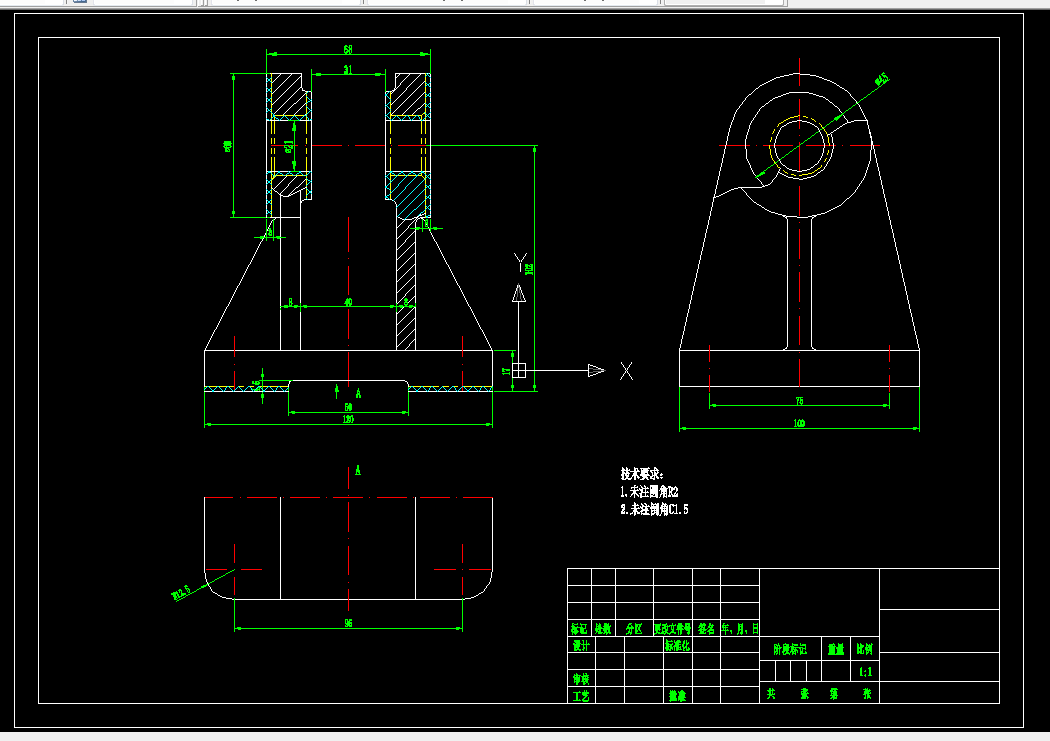 支架加工工艺规程及其夹具设计是包括零件加工的工艺设计、工序设计以及专用夹具的设计三部分。在工艺设计中要首先对零件进行分析,了解零件的工艺再设计出毛坯的结构,并选择好零件的加工基准,设计出零件的工艺路线;接着对零件各个工步的工序进行尺寸计算,关键是决定出各个工序的工艺装备及切削用量;然后进行专用夹具的设计,选择设计出夹具的各个组成部件,如定位元件、夹紧元件、引导元件、夹具体与机床的连接部件以及其它部件;计算出夹具定位时产生的定位误差,分析夹具结构的合理性与不足之处,并在以后设计中注意改进。