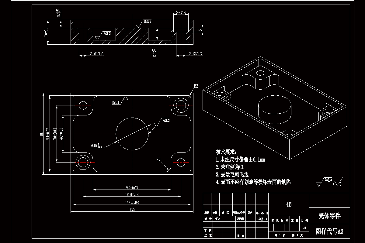 本次设计任务是对零件的加工工艺设计与CAM,使用CAD制图软件将零件的二维图形画出来,再用UG软件画出三维图纸。接着对零件结构、精度、技术要求进行分析。设计加工零件的数控工艺方案,选择毛坯材料及大小、加工用的刀具、加工机床,以及合理的切削参数等。选择出最佳的加工工艺方案,然后使用UG中的CAM模块对零件的数控加工程序进行编制,完成本次设计。