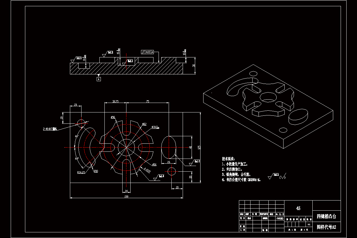 本文以四键槽凸台零件为例,详细说明了该零件的工艺编制与数控加工过程。在开始编程前,先针对零件设计图纸和技术要求进行详细的数控加工工艺分析,以最终确定哪些是零件的技术关键,哪些是数控加工的难点,以及程序的编制难易程度;然后使用UG NX软件完成零件三维模型造型、二维零件图绘制及数控自动编程;最后在数控机床上完成零件加工,检验后,零件合格。