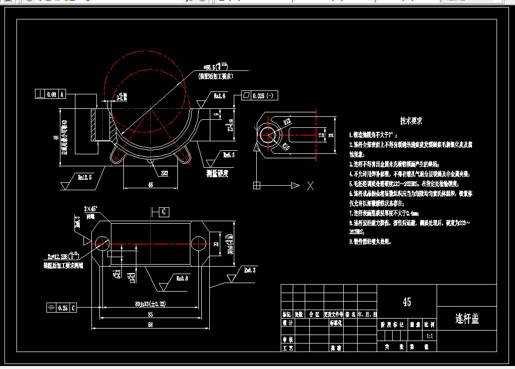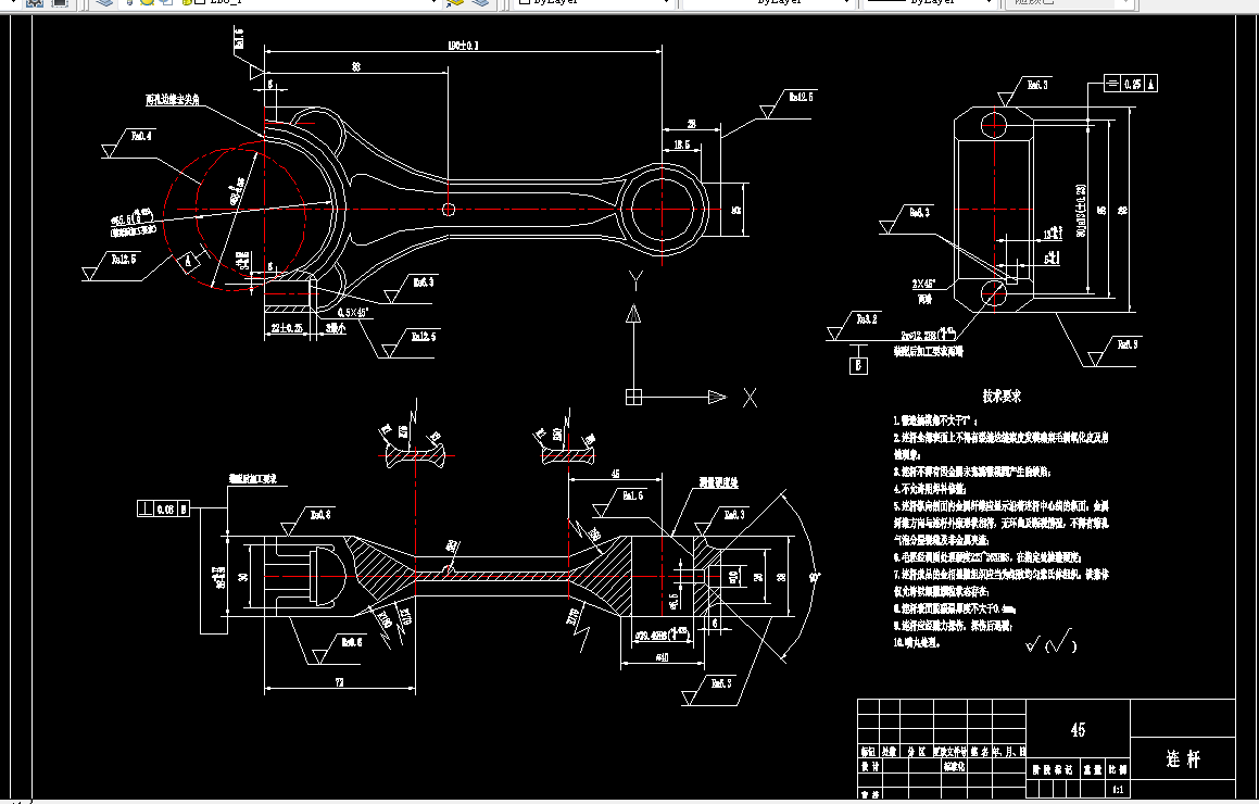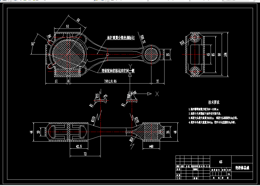 我的设计题目是柴油机连杆机械加工工艺规程及其钻连杆体小头油孔Φ6.5mm、Φ10mm夹具设计,柴油机连杆材料为45钢,壁厚、应力分布均匀。设计分为两部分:柴油机连杆工艺和钻连杆体小头油孔Φ6.5mm、Φ10mm夹具。