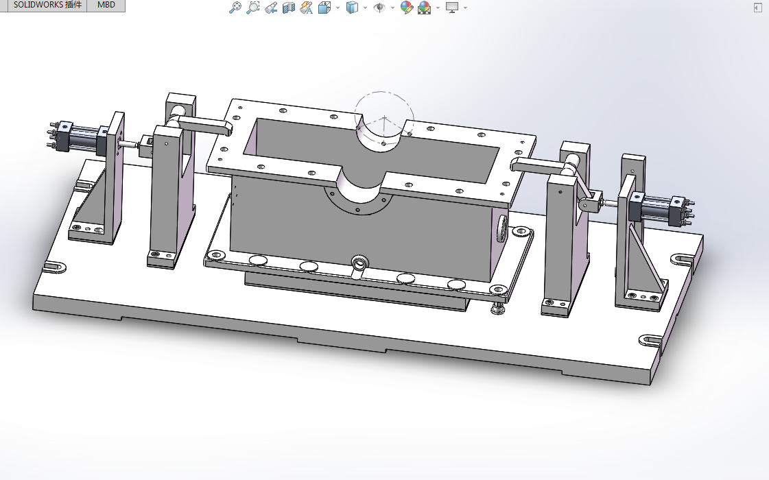 曲轴箱箱体后端面夹具设计,由曲轴箱箱体结构分析知,采用底面及底面上两个Φ18孔定位;夹紧所给的设计要求为自动夹紧,故采用气压缸、压板、支架等组成的气动夹紧机构夹紧曲轴箱箱体;后端面所在位置知,采用Φ25圆形对刀块、对刀块底座和塞规等来保证铣刀正确位置。