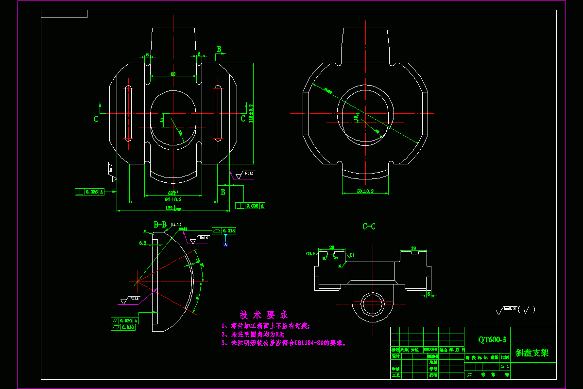 本文主要是斜盘支架零件的机械加工工艺及工装设计,在工艺设计中要首先对零件进行分析,了解零件的工艺再设计出毛坯的结构,并选择好零件的加工基准,设计出零件的工艺路线;接着对零件各个工步的工序进行尺寸计算,关键是决定出各个工序的工艺装备及切削用量;然后进行专用夹具的设计,选择设计出夹具的各个组成部件,如定位元件、夹紧元件、引导元件、夹具体与机床的连接部件以及其它部件;计算出夹具定位时产生的定位误差,分析夹具结构的合理性与不足之处,并在以后设计中注意改进。