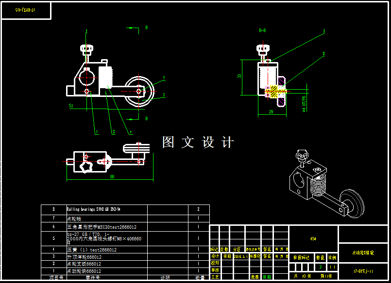 设计主要针对的是一种在市场上很少见的印刷接纸结构设计,在现代的科学技术高速发展的今天,工艺机械加工生产技术也在稳步发展,而机械加工制造的辅助设备优势越来越得到了优化以及改进。而对于备料机构的相关成熟技术,目前国内和国外已经设计出来一些很高的水平,特别国外实现的自动化水平很高。尽管国内和国外对于备料机构机的所用的核心技术大多是高新技术传送方式,以及大批量生产的生产模式,然而对于纯机械结构的印刷接纸结构的设计则相对较少。这篇将围绕印刷接纸结构的结构设计提出两种方案,并且对比两种方案,进行合理的分析,进而选择结构最为简单、机械加工效率最高、使用效果更好和备料印刷的质量较高的机构作为最终方案。下文将对该方案做结构分析、原理分析和简单的力学分析。从而对该机构各个零件做出详细的设计和分析,并且绘制出相应的装配图和零件图等等。