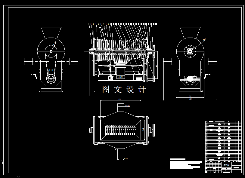 通过电机驱动小皮带轮,皮带将动力专递到大皮带轮,从而带动整个旋转机构的旋转。花生剥壳机旋转机构结构为25组垂体依次排列,通过键连接固定到主轴上,右侧固定套进行轴向固定;主轴在两侧直径φ45处,通过带方形座轴承UCFU209固定;为了保证旋转机构能够更好的承受轴向载荷,在两侧分别放置了推力球轴承51210,该轴承是放置在轴承座中,同时轴承座上还设计了JBZQ4075Z形橡胶油封55的安装位置,充分保证设备的密封性;机构左侧的大皮带轮通过M39×1.5圆螺母锁紧在主轴上。整个装置进料口在上方,花生进入设备中通过旋转机构上的垂体进行破碎,花生仁和花生壳落入底部,通过风机将花生壳吹走,花生仁自动掉落到容器中。论文里对皮带传动进行了仔细设计与计算、对花生剥壳机主要零部件进行了强度校核、并绘制了设备的三维模型且转化了二维图纸、通过ANSYS软件对主轴进行了有限元分析。