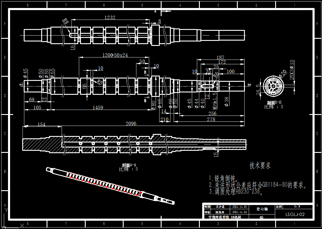 机械的发展和不断改进的需求是过滤机发展的大环境因素。我国工业企业基数很大,如果可以研发出具有高效率、应用便捷且适应范围广的过滤设备,不但可以帮助企业节约能源,提高产品的生产效率,更可以帮助企业提高自身的竞争实力。工业企业基数大就意味着需要和适用过滤机的企业有很多,这对过滤机的发展是很大的契机。 全自动立式过滤机,通过电机驱动小皮带轮,皮带将动力专递到大皮带轮,从而带动整个旋转机构的旋转。立式过滤机旋转机构结构为25组过滤盘依次排列,通过键连接固定到空心轴上,右侧固定套进行轴向固定;空心轴在两侧直径φ45处,通过带方形座轴承UCFU209固定;为了保证旋转机构能够更好的承受轴向载荷,在两侧分别放置了推力球轴承51210,该轴承是放置在轴承座中,同时轴承座上还设计了JBZQ4075Z形橡胶油封55的安装位置,充分保证设备的密封性;机构左侧的大皮带轮通过M39×1.5圆螺母锁紧在空心轴上。整个装置进水口在上方,污水进入罐体内通过旋转机构上的过滤盘对污水进行过滤,最终流向空心轴的内腔从设备底部排出。 论文里对皮带传动进行了仔细设计与计算、对过滤机主要零部件进行了强度校核、并绘制了设备的三维模型且转化了二维图纸、通过ANSYS软件对空心轴进行了有限元分析。