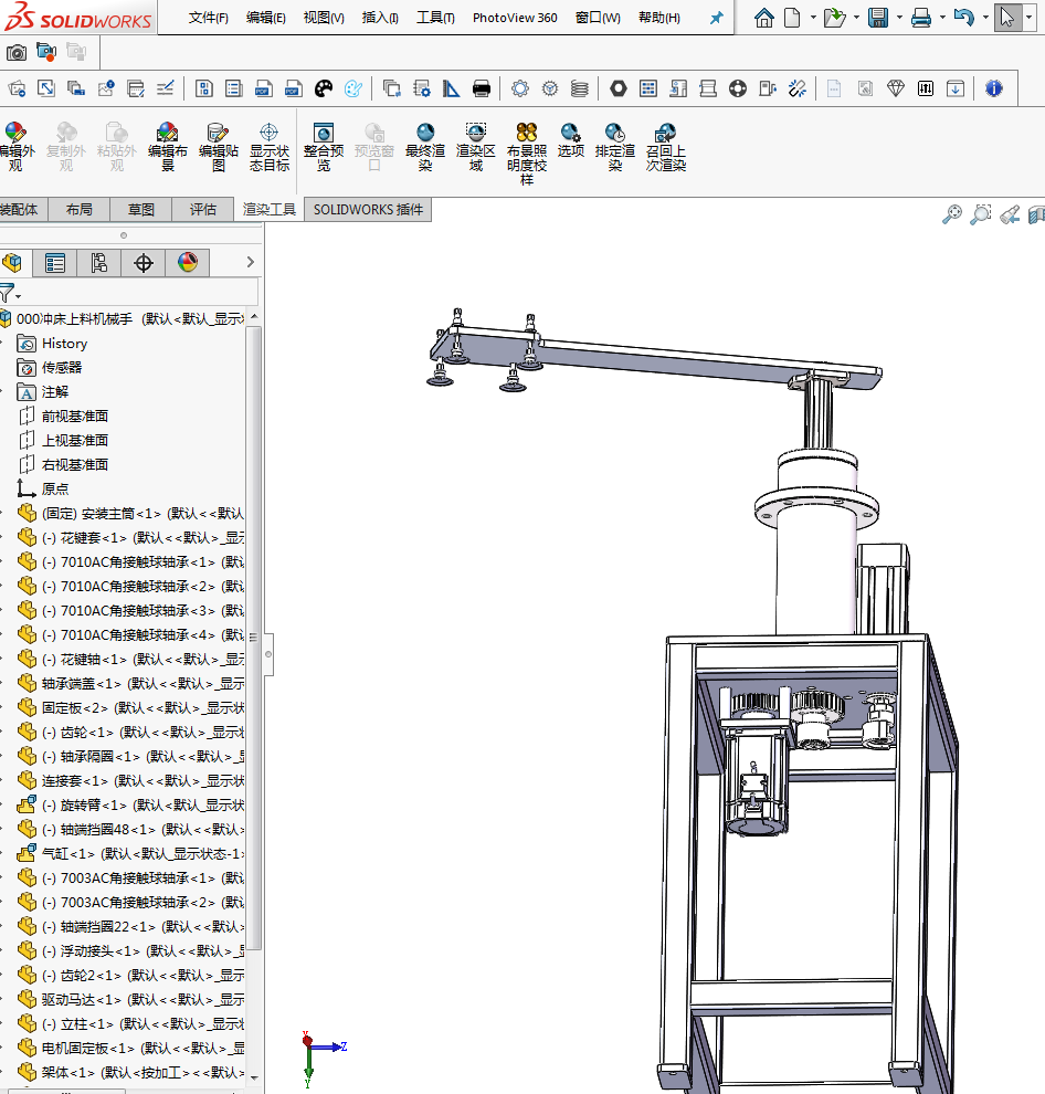 使用冲床通过自动上料装置可以减少工件的装卸时间,避免工件被搬运和转移从而减少时间,同时还可以减少调整设备等时间,从而提高工件的加工效率。冲床工件进行加工可以使得被加工的工件具有更高的精度,可以使工件更好的满足设计和使用的规格。自动上料装置对产品的加工、质量和效率都起着非常重要的作用。本设计为冲床的上料机械手,能保证冲床有节奏、安全工作。实现手部自由度的运动,完成工件的上料工作。抓重1kg、手臂回转60°、送料频率50~60次/分、定位精度:±0.1mm。本次设计采用单臂回转式机械手,拥有两个自由度,分别是Z轴的升降和Z轴的旋转。该机械手旋转臂末端布置有吸盘,通过吸盘吸附待加工的钣金原料,在旋转60°之后放置于冲床工作台。该设备的动作顺序为:伺服电机驱动齿轮B转动,齿轮B与齿轮A啮合,带动机械手整体顺时针旋转到60°停止;气缸收回同时机械手机械臂上的吸盘吸附钣金原料;气缸伸出;伺服电机驱动齿轮使机械手整体逆时针转动60°;气缸收回,将钣金原料放置于冲床工作台;气缸伸出;机构顺时针旋转60度重复以上动作。本文对升降机构和旋转齿轮进行了详细设计,并通过solidworks三维软件对机械手进行了三维建模,并绘制了二维CAD图纸。