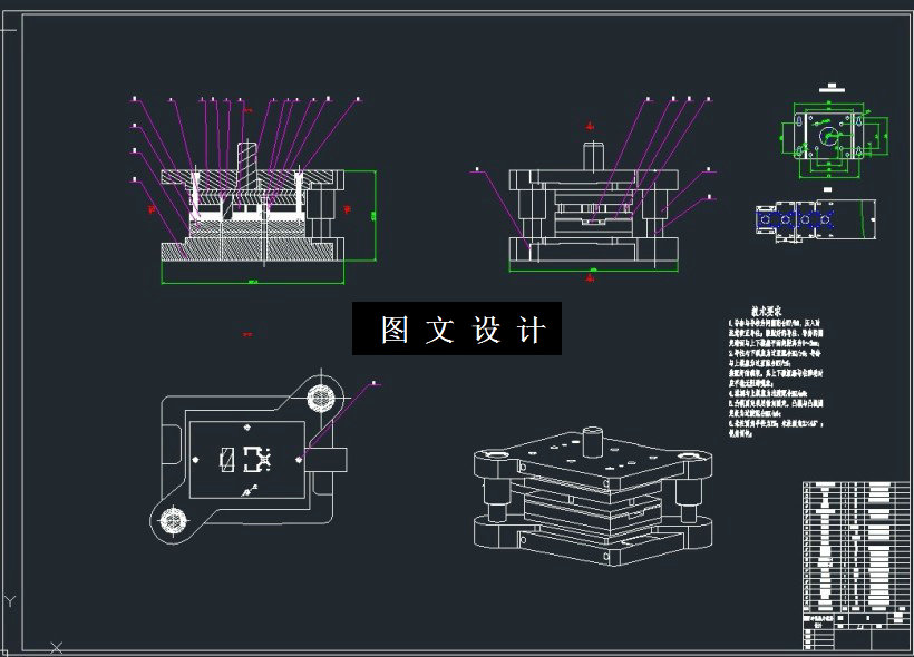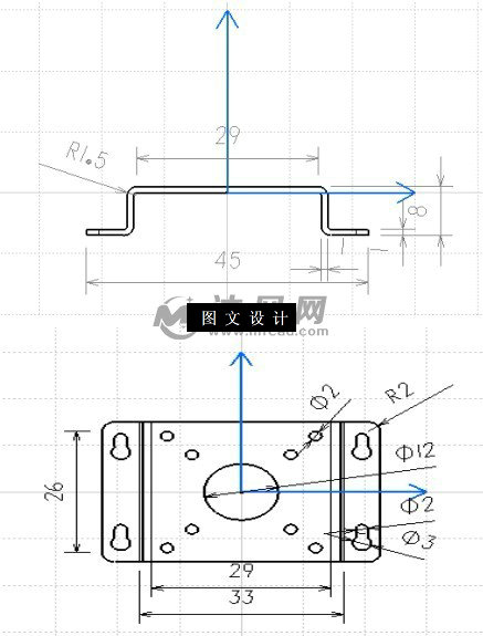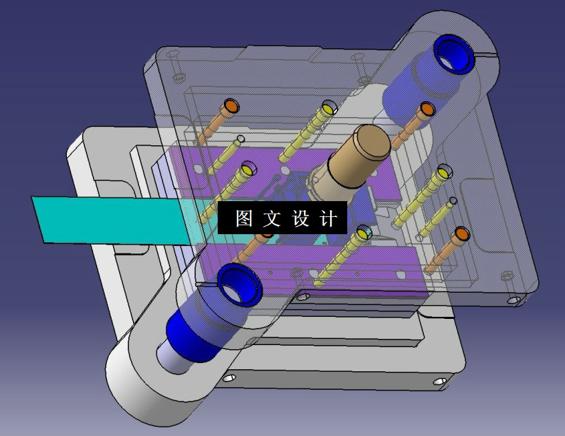 设计的制件0.5mm厚,外形精简,是对称图形。主要工序有冲孔、落料、翻折,适合大批量生产。此次材料采用优质碳素结构钢:10号钢,机械性能好,抗拉强度和变形度好,可冲孔成型。制件要完成的加工过程为冲孔、翻折。产品是简单的形状、没有不规则凹槽、棱角,面积尺寸小。这个制件是帽形零件弯曲模,从制件图了解到这个制件尺寸小,适合多工序连续加工,也就是冲孔、翻折过程,要是是用单个工序,零件在换工序的过程中操作者加工难度高,并且给下道工序的定位增加困难,综合各方面原因,决定使用级进模具加工这个零件。在设计形成之后,使用有限元软件对工件进行力分析,最后进行运动模拟。设计中相关二维图纸为CAD格式,三维模型为CATIA V5R20格式,并存有IGS通用格式、可通过各种三维软件打开,欢迎您的下载