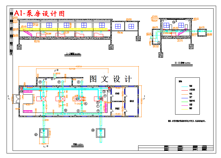 在拟建一级泵站的河流断面及净水厂的空地布置有钻孔。由地质柱状图可看出,0~2m深为砂粘土,以下是页岩。沿河A城段百年一遇最高水位40.36m,最低水位32.26m, 正常水位36.51m(系黄海高程)。A城最大日用水量为 12 万吨/日,一期完成。净水厂内反应沉淀池进水口设计水位45.50m,清水池最高水位42.30m,清水池最低水位40.20m。泵房室外地面标高44.4m。输水管网中未设水塔。输水干管长度约为120m。出厂水水压要求达到4.0kg/cm2。