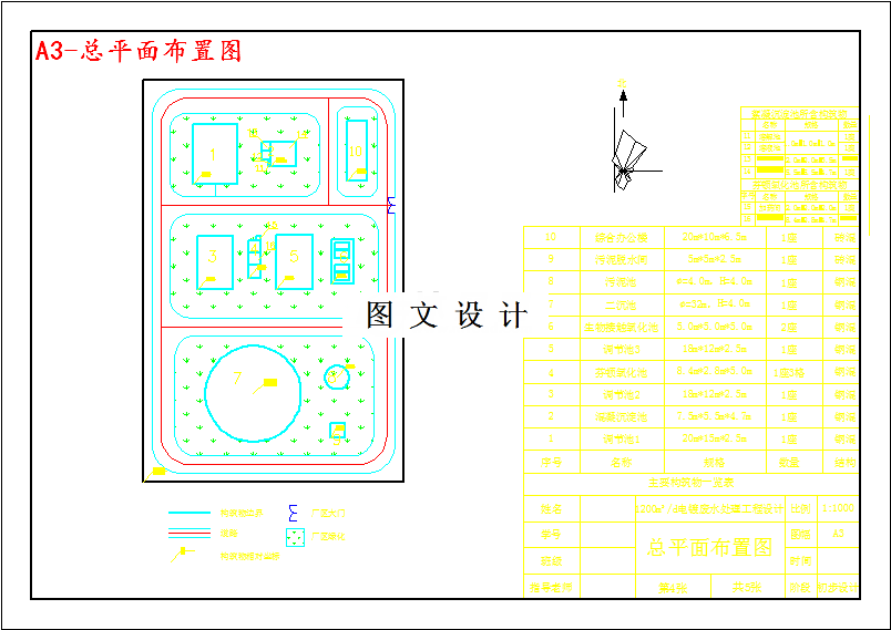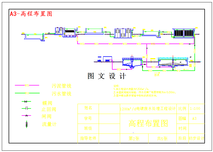 本设计是针对某电子厂的综合电镀废水进行处理,其水质情况为 PH:4—8、 Cu2+:5mg/l、CODCr:300mg/l、氨氮:15mg/l、SS:100mg/l、CN-:0.08mg/l、 而含镍废水的 Ni 2 浓度为 30mg/L,但在前期处理中已 100%回用。其中,规定 在车间或生产设施排放口监控的污染物,需在车间或生产设施排放口收集和处 理;规定在总排放口监控的污染物,需在废水总排放口收集和处理。经过本设计 处理后其水质情况为 PH:6—9、Cu2+:0.3mg/l、CODCr:50mg/l、氨氮:4.72mg/l、 SS:8.1mg/l、CN-:0.05mg/l。本工程的总投资为 314.62 万元,其中工程费用为 143 万元,设备费为 73.64 万元,其他费用为 27.1 万元,药剂费为 70.88 万元,单 位处理成本为 7.18 元/m3 污水。