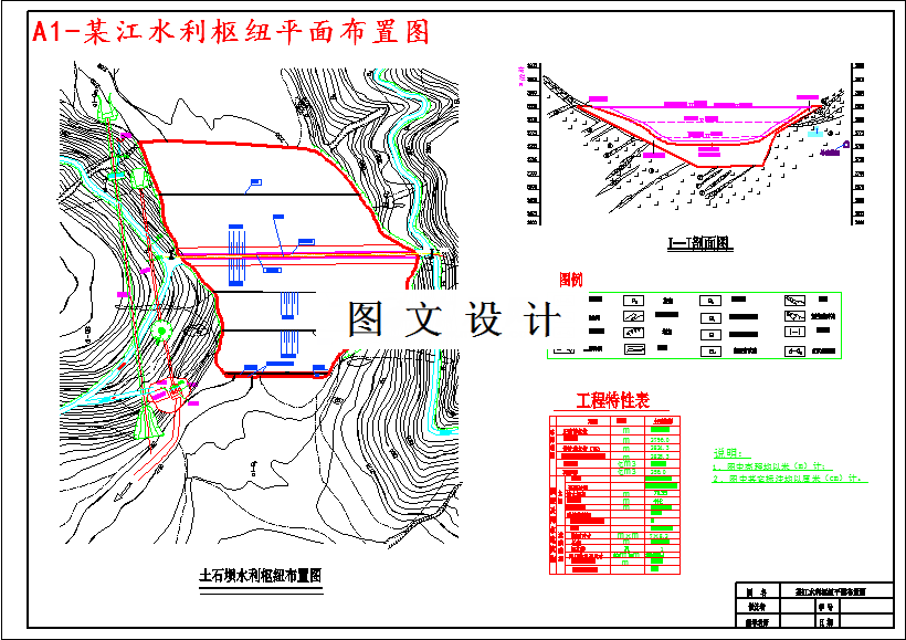 本设计对我国西南地区某江水利枢纽进行了以坝工为重点的工程设计。该坝为心墙土石坝,正常蓄水位2822.8米,汛限水位2822.8米。首先是根据某江流域的自然地理,水文气候特征确定工程等级,并进行洪水调节计算。在可行的几种泄流方案中,择优选出采用的方案和相应的设计与校核水位。然后进入主要建筑物设计。确定枢纽的组成建筑物,包括挡水建筑物、泄水建筑物、水电站等。在定性分析的基础上,确定出大坝的型式及坝址和坝轴线。在第一主要建筑物设计阶段,确定出大坝的基本剖面和轮廓尺寸,拟定地基的处理方案和坝身构造。之后依次进行了土料设计、渗流计算、渗透稳定校核、稳定计算和细部构造设计,从各个方面验证了设计剖面的可行性。最后为第二主要建筑物设计。确定出泄水建筑物的结构型式和轮廓尺寸,进行选线布置。进行水力计算,从泄流能力、净空要求、挑距和冲刷深度等方面验证设计型式的可行性。并进行细部构造设计。