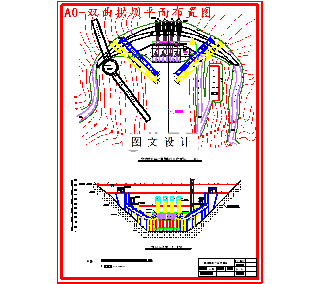 A江是我国东南地区的一条河流,根据流域规划拟建一座水电站。 A江水利枢纽同时兼有防洪、发电、灌溉、渔业等综合作用,水库正常蓄水位183.25m,设计洪水位186.45m,校核洪水位189.2m,汛前限制水位182m,死水位164m,尾水位103.5m。A江水利枢纽工程等别为一等,工程规模为大(1)型工程,主要建筑物级别为1级,次要建筑物级别为3级,临时性建筑物级别为4级。A江水利枢纽的主要组成建筑物有挡水建筑物、主副厂房、泄水建筑物、过木筏道等。经过坝型比选,选定挡水建筑物为一变圆心变半径的双曲拱坝,坝顶弦长307m,最大坝高98.45m,坝底厚25.5,坝顶宽8.35m。设计中对四种工况的坝体应力分别采用了电算和手算,手算运用拱冠梁法。泄水建筑物由两个浅孔和两个中孔组成:浅孔位于两岸,孔口宽8.5m,高8.0m,进口底高程为164m,出口底高程为154m;中孔位于水电站进水口两侧,孔口宽7.5m,高7.0m,进口底高程为135m,出口底高程为130m。在坝身泄水孔的上下游侧分别布置检修闸门和工作闸门,检修闸门采用平板门,工作闸门采用弧形闸门,在每一个工作闸门的上方有启闭机房,浅孔启闭机房高程为174m,中孔启闭机房高程为150m。泄槽支撑结构采用框架式结构。坎顶高程为119m,浅孔反弧半径为40m,中孔反弧半径为50m。泄槽直线段的坡度与孔身底部坡度一致,挑射角θ=20o,导墙厚度为1.0m, 浅孔导墙高度为7m,中孔导墙高度为8m。坝后式厂房装有4台5万kW的发电机组,主厂房长81m,宽18m,副厂房长66m,宽10m,安装场长21m,宽18m。压力管道的直径为4.6m,进水口底高程为157m。发电机层高程为114.8m,尾水管底高程为90.8m,厂房顶高程为130.5m。为防止坝基渗漏,在坝基靠近上游侧进行帷幕灌浆,并且为了减少坝基的扬压力,在灌浆帷幕之后设置排水孔。各孔间距均为5.0m。为了防止混凝土产生裂缝,拱坝坝体设置横缝,横缝面上需设置键槽,以咬合加固,增强坝体的抗剪能力。当底宽在40~50m以上的拱坝,才考虑设置纵横缝,而本设计中,拱坝坝底宽为25.5m,小于40m,故可不设置纵缝。
