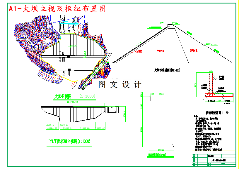 本次设计主要是为了开发利用B江流域的水利资源,建设一个以发电为主,同时兼顾灌溉、供水、防洪及养殖等综合利用效益的跨流域开发的水利水电枢纽工程。在明确了建设目的并具有了建设依据和条件后设计的枢纽概况如下:B江水利枢纽为复合土工膜防渗堆石坝最大坝高56米,装机6400kW,电站设计水头174米,保证出力1461kW,装有两台3200kW机组,正常蓄水位276.2m,主坝长236.5米左右,上游边坡1:1.5,下游边坡1:1.52;1:1.53。本次设计主要内容为:经洪水调节确定坝顶高程;坝型的比选;第一主要建筑物的设计;施工组织设计。并进行了导流隧洞投标文件的编写。复合土工膜防渗堆石坝是一种新的坝型,其防渗材料---复合土工膜的设计、施工、质量控制是该类坝型的技术关键。本工程导流隧洞施工具有施工工作断面小,工期紧的特点,故其施工工艺是关键。本次设计以一般混凝土面板堆石坝和一些已建复合土工膜堆石坝为参考,在注重各细部独立分项设计的同时,综合考虑了整体工程的统一性。在专题的编写中参考已建工程的导流隧洞,对导流隧洞的施工组织进行了设计,确保按期完成导流隧洞标段工程。在设计过程中既充分运用了所学知识,广泛参考了堆石坝设计、施工等相关书籍,并在规范规定内设计,体现了本设计的科学性、规范性。