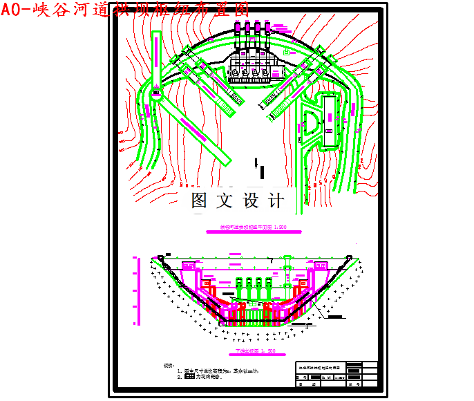 A江水利枢纽同时兼有防洪、发电、灌溉、渔业等综合作用,水库正常蓄水位184.5m,设计洪水位187.35m,校核洪水位189.96m,汛前限制水位182.0m,死水位164m,尾水位103.5m.水库总库容12.27亿m3。A江水利枢纽工程等级为一等,工程规模为大(1)型工程,主要建筑物等级为1级,次要建筑物等级为3级,临时建筑物等级为4级。A江水利枢纽的主要组成建筑物有挡水建筑物、主副厂房、泄水建筑物、过木伐道等。挡水建筑物为一变半径变中心角的双曲拱坝,坝高100m,坝顶宽8.5m,坝底厚25.5m。泄水建筑物由两个浅孔和两个中孔组成:浅孔位于两岸,孔口宽8.5m,高8m,进口底高程164m,出口底高程154m;中孔位于水电站进口两侧,孔口宽7.5m,高7m,进口底高程135m,出口底高程130m。在坝身泄水孔的上下游侧分别布置检修闸门和工作闸门,检修闸门采用平板门,工作闸门采用弧形闸门,在每个工作闸门上有一个启闭机房,浅孔启闭机房高程为176m,中孔启闭闸门高程为150m。泄槽支撑结构采用框架式结构。坎顶高程119m,浅孔反弧段半径为40m,中孔反弧段半径为50m。泄槽直线段的坡度与泄槽底部坡度一致,挑射角θ=200,导墙厚度为1m,浅孔导墙高度7m,中孔导墙高度8m。坝后式厂房装有4台5万千瓦的机组,主厂房长81m,宽18m,副厂房宽66m,宽10m,装配厂长21m,宽18m。压力管道直径为4.6m,进水口底高程为157m。发电机层高层114.8m,尾水管底高程90.8m。为防止坝基渗漏,在坝基靠近上游侧进行帷幕灌浆,并且为了减小坝基处的扬压力,在帷幕后设置排水孔。为了防止混凝土产生裂缝,拱坝坝体设置横缝,横缝面上需设键槽,以咬合加固,增强坝体的抗剪能力。当底宽在40~50m以上的拱坝,才考虑设纵缝,而本设计中,坝顶厚25.5m,小于40m,所以可不设纵缝