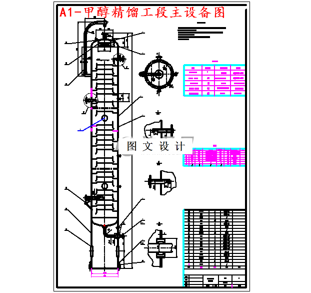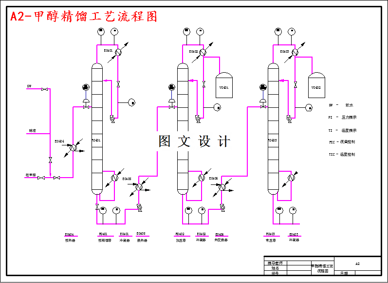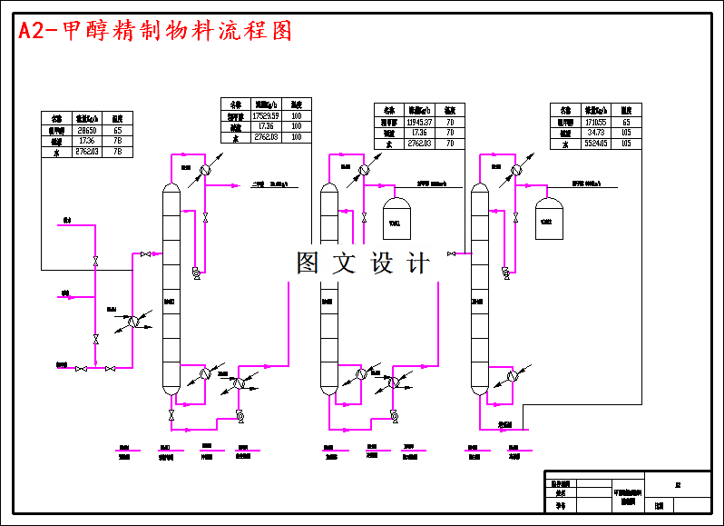 甲醇精馏的双塔流程是目前采用最普遍的工艺。双塔中的第一塔为预精馏塔,第二塔为主精馏塔,预塔和主塔的再沸器的热源均来自于循环气压缩机产生的低压蒸汽。 预精馏塔的作用是分离出粗甲醇中的轻组分和溶解在溶液中的气体(如H2、CO2、CO等)。预塔塔顶大部分的水和甲醇进行回流,同时为了减少挥发性小的轻组分的量,还需要从冷凝器中排出小部分的冷凝液。同时还可以在塔顶设置冷凝器进行二级冷凝,以减少甲醇的损失量。主精馏塔的作用主要是除去粗甲醇中的重组分(包括H2O、CH3OH和高级醇等),以得到符合要求的精甲醇。从预精馏塔出来的原液经由塔底输送到主精馏塔的进料口,高级醇由加料板以下的侧线引出,含有微量甲醇的水溶液从塔底排除,而精甲醇则变成甲醇蒸汽并由塔顶处冷凝后采出。