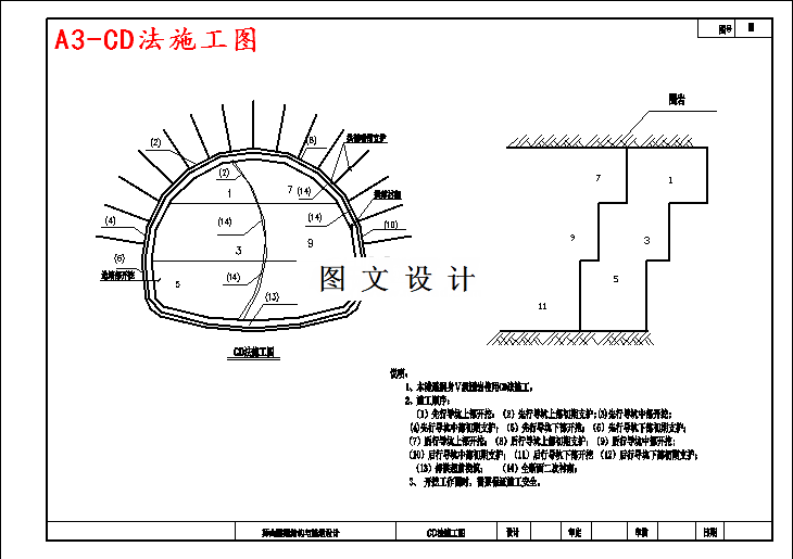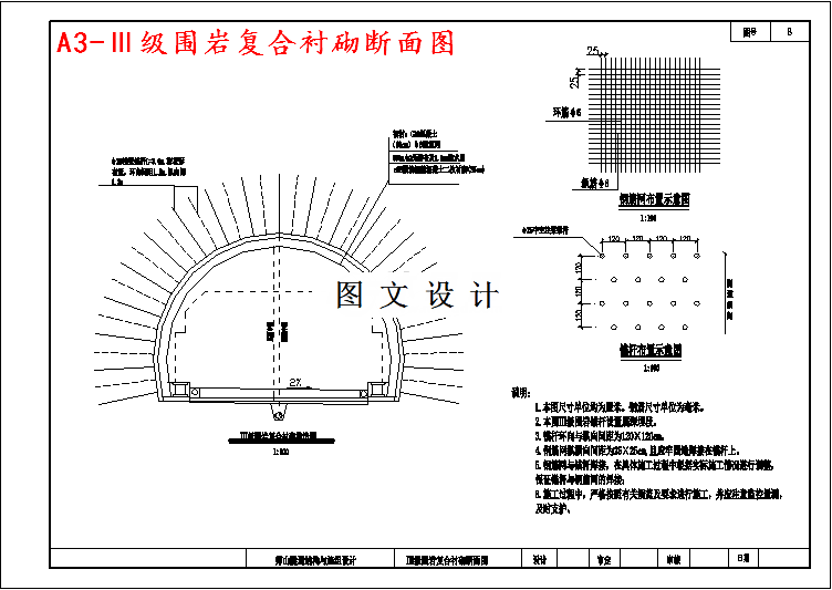 某隧道为分离式单向行驶两车道隧道,公路设计等级为高速公路,设计时速为100km/h,隧道全长493.4m。洞门采用翼墙式洞门。隧道结构设计采用复合式衬砌,以支护结构作为主要承载结构,充分发挥围岩的自承能力。洞门的设计和初期支护,按照工程类比法并参照有关规范,先选定合适的参数进行洞身结构设计,再选取具有代表性的断面进行稳定性验算。二次衬砌采用北京理正隧道设计系统计算。隧道的辅助施工方法有超前小导管注浆和超前锚杆等。