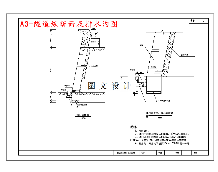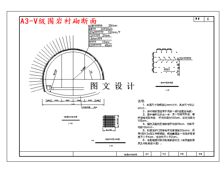 本设计为湖南省湘乡市寨子岗隧道设计,设计为单洞双向隧道,隧道全长3757m,设计行车速度为350km/h,衬砌内轮廓采用三心圆拱曲墙式。 根据提供的工程地质资料及相关设计标准、规范的要求,本隧道采用新奥法设计施工。初期支护采用锚喷支护:即使用锚杆和钢筋网和喷射混凝土作为初期支护,模筑混凝土作为二次衬砌,二者共同作用来形成整个隧道的结构支护体系。 该隧道工程的设计内容由七部分组成。第一部分为工程概述,主要介绍隧道区的地形、地质条件,设计依据及标准;第二部总体设计,根据规范的要求和标准确定隧道横断面的形式;第三部分对隧道洞门进行设计,包括对洞门的几何尺寸的确定、抗滑、抗倾、以及墙身截面应力的验算;第四部分为衬砌设计与内力计算、洞身配筋计算,根据隧道的结构受力分析对隧道进行配筋等计算;第五部分为隧道爆破设计,根据地质以及隧道的要求确定隧道的爆破施工参数,炮眼布置等;第六部分为隧道附属设施设计,包括排水等。第七部分为施工组织设计,具体解释说明施工工艺。