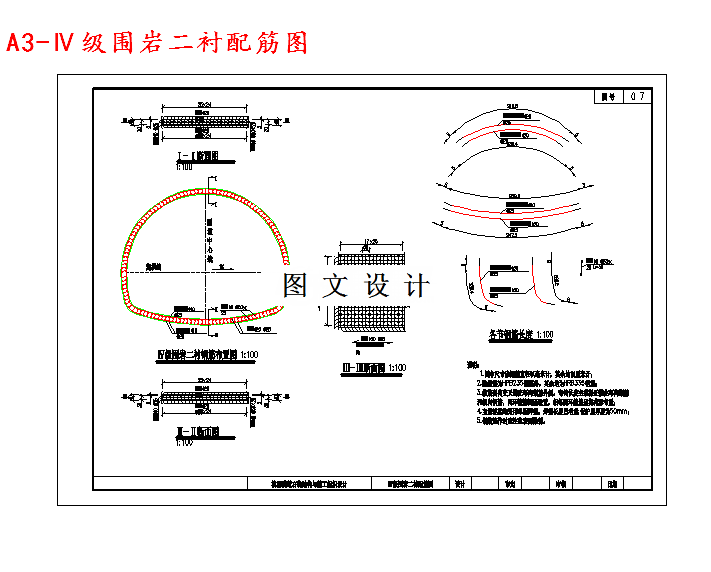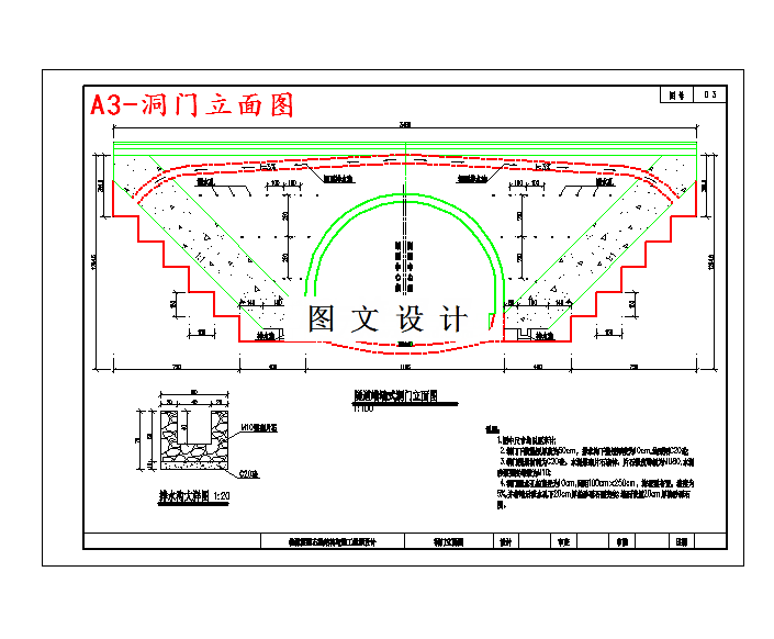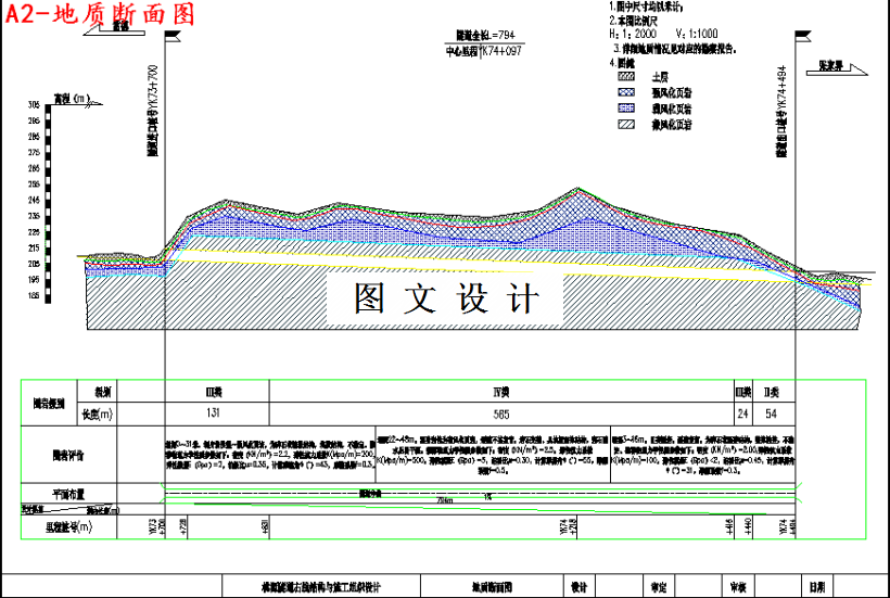 隧道作为交通的重要组成部分,在山岭地区具有作克服地形或高程障碍,优化道路线形、缩短公路里程,减少对植被的破坏,保护生态环境等优势。同时对促进周边地区经济发展及国防建设也具有深远影响。 本设计是对常张高速公路桃源隧道右线的一个综合设计。桃源隧道为山岭分离式双向四车道中隧道,全长794m,设计时速80km/h。隧道进出口洞门均选用端墙式洞门。隧道衬砌形式为复合式衬砌(初期支护和二次衬砌) 。二次衬砌设计计算采用理正岩土软件进行了数值分析与计算,分别得到围岩与结构变形、抗力、轴力、剪力与弯矩以及位移分布图,并依据计算结果进行了二次衬砌配筋设计。洞门和衬砌的各项验算均满足要求。隧道的防水和排水均符合设计的规定。同时,还进行了隧道附属与辅助设施设计以及施工组织设计。隧道采用新奥法原理施工。隧道开挖方法有:全断面法 (Ⅱ、Ⅲ级围岩 )和台阶法 (Ⅳ级围岩 ),其中爆破方式均采用光面爆破。