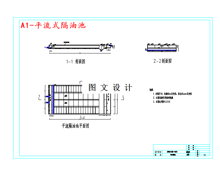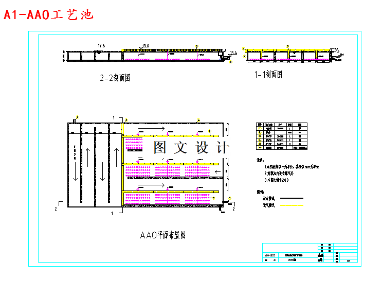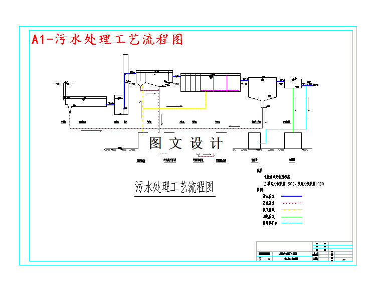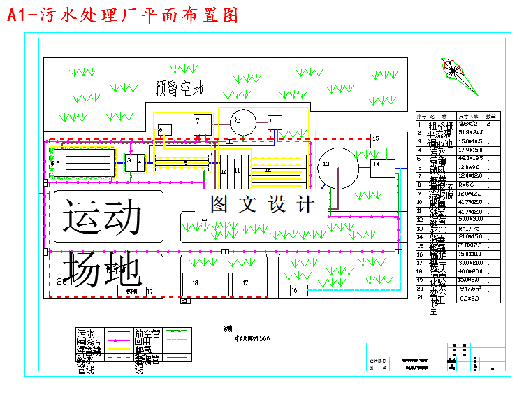 已建的废水深度处理项目。总处理量30000m3/d,其中达标排放为10000 m3/d,锅炉回用水20000 m3/d。 1.方案选择合理,确保污水经处理后的排放水质达到国家排放标准 2.所选厂址必须符合当地的规划要求,参数选取与计算标准 3.全国布置分区合理,功能明确,厂前区,污水处理区污泥处理区条块分割清楚。沿流程方向依次布置处理构筑物,水流创通。厂前区布置在上方向并用绿化隔离带与生产区隔离,以尽量减少对厂前区的影响,改善厂前区的工作环境 4.构筑物的布置应给厂区工艺管线和其他管线设有余地,一般情况下,构筑物外墙距道路边不小于6米。 5.厂区设置地秤标高尽量考虑土方平衡,减少工程造价,同时满足防洪排涝要求。 6.水力高程设计一般考虑一次提升,利用重力依次流经各个构筑物,配水管的设计需优化,以尽量减少水头损失,节约运行费用。 7.设计中应该避免磷的再次产生,一般不主张采用重力浓缩池,而是采用机械浓缩脱水的方式,随时将派出的污泥进行处理。 8.所选设备质优,可靠,易于操作。并且设计必须考虑到方便以后厂区的改造。 9.附有平面图和高程图各一份。