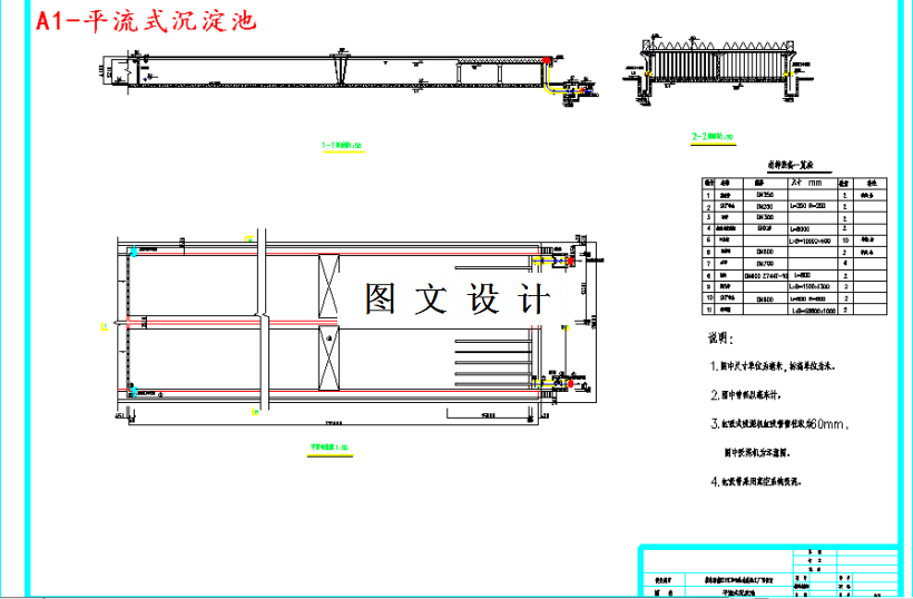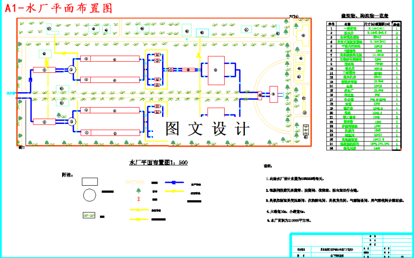 本次净水厂设计的目的在于加深理解所学专业理论,培养运用所学知识综合分析和解决实际工程设计问题的初步能力,在设计、运算、绘图、查阅资料和设计手册以及使用设计规范等基本技能上得到初步训练和提高。本设计的内容是根据所给资料,设计某市路南区的供水工程,要求对方案进行设计,对主要处理构筑物的工艺尺寸进行计算,确定水厂平面布置和高程布置,最后绘出水厂平面布置图、高程布置图、管线布置图、绿化施工图和某个单项处理构筑物(澄清池或过滤池)的单体图(包括平面图、剖面图)及设备选型,并写出一份设计计算说明书。本设计中所给的设计水量为180000m3/d,取水厂自用水量为设计水量的10%,则水厂的设计规模为198000m3/d。