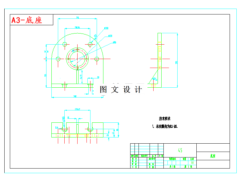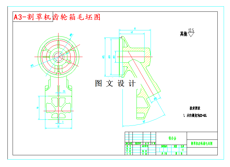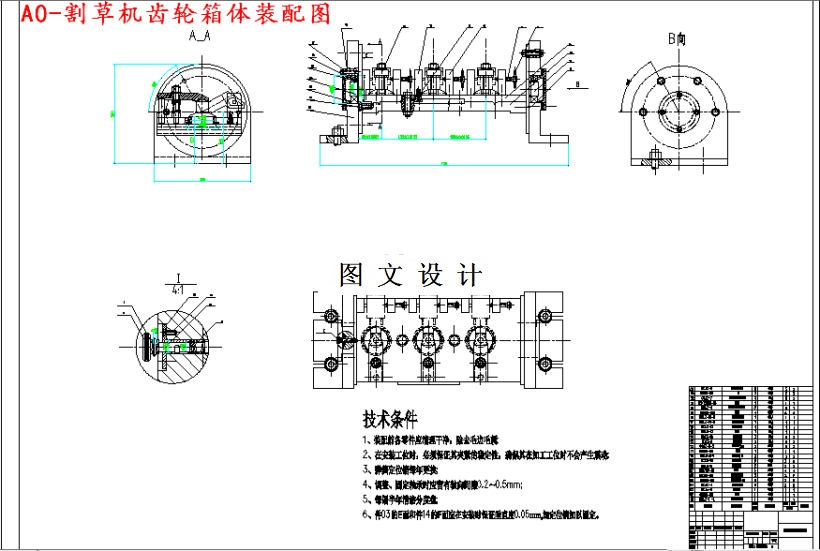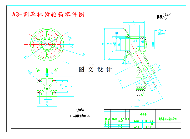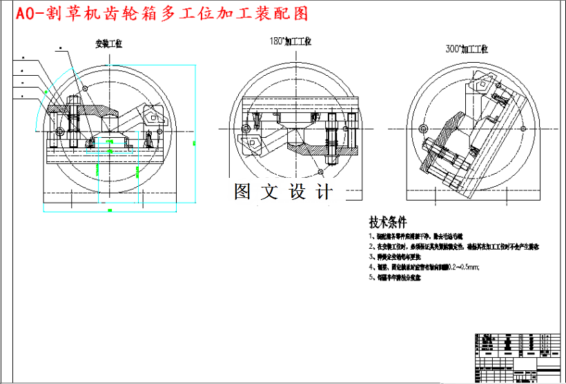 本设计对割草机齿轮箱支架的加工进行多工位夹具的设计。通过对各种定位夹紧装置的分析比较,选择并组合了一套既能够满足加工要求的,又比较简洁的装置。同时,通过对一系列定位误差和夹紧力的计算,验证了该零件的加工是可以保证其要求的精度的,它的加工误差在规定的范围内。通过夹紧力的计算,也验证了零件在被夹紧的前提下,它受到的夹紧力也并不大,满足夹具设计所要求的既要保证一定的夹紧力不使工件在加工过程中发生位移,但同时又不能过大致使工件发生变形。 旨在通过这一专用夹具,能够加工出一组成60度角的阶梯孔。由于是阶梯孔,所以可以采用组合刀具来加工,提高其生产效率。夹紧机构采用螺旋夹紧机构。为了加工60度孔,用分度盘对其定位。用定位销保证定位牢靠。并且,本装置采用了导轨副形式和多工位形式,提高生产的效率。