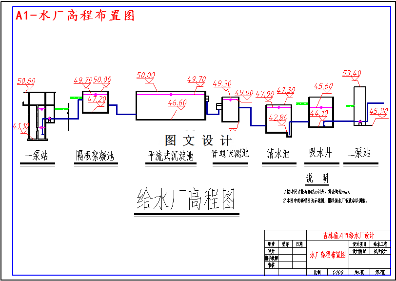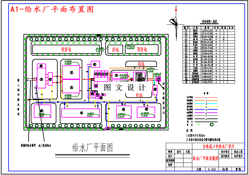 本设计通过对吉林省饮用水系统当前的形势和所存在的问题进行分析,强调建设供水厂的必要性和紧迫性,并进行给水厂处理工艺的初步设计。在本设计中,首先对国内饮用水水源现状进行分析,介绍水处理工艺的发展;基于对水源、水质和目的地周边地区的状况进行调查,从而对水厂进行设计。通过分析比较,设计了给水处理厂的工艺处理方案:管式静态混合器—回转式隔板絮凝池—斜管沉淀池—普通快滤池—氯气消毒。并详细计算各个反应池参数,运用绘图软件绘制主体构筑物,完成给水厂处理水工艺初步设计。