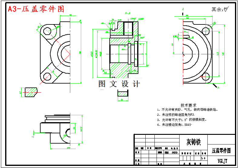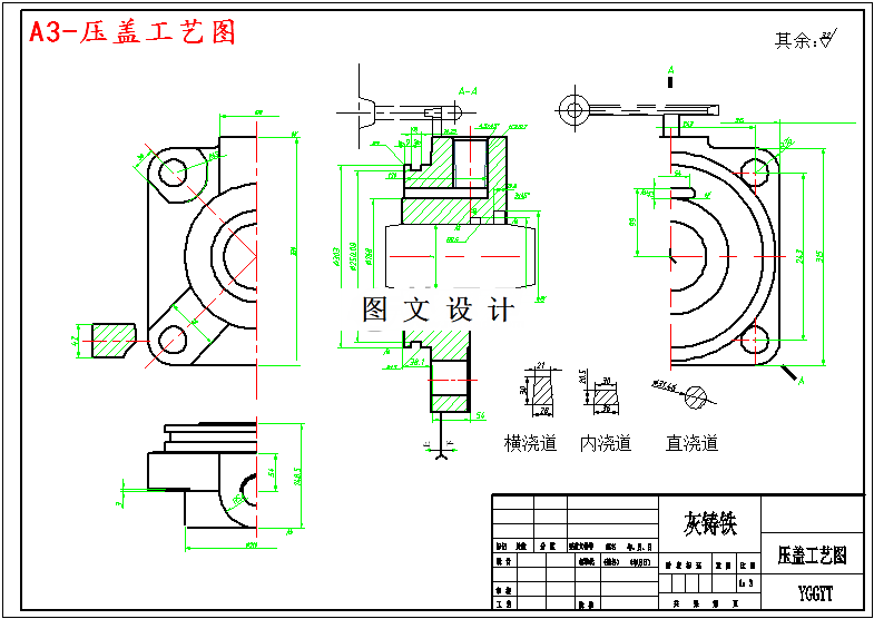本次采用湿型,并采用砂箱造型。造芯方法选择热芯盒造芯,砂芯材料选择为树脂砂。由于每个铸件的生产任务和要求不同,生产条件不同,因此,铸造工艺及工装设计的内容也不同。一般情况下,铸造工艺设计包括以下几种技术文件:铸造工艺图,铸造工艺卡,铸型装配图,铸件图,模样图,芯盒图,砂箱图,模板图。工艺设计总线索是:根据已下达的课题任务--零件图,做详细的工艺分析,绘出铸件工艺图,然后以工艺图为依据,绘出铸件上(或下)模样图,毛坯图,设计出模样图。