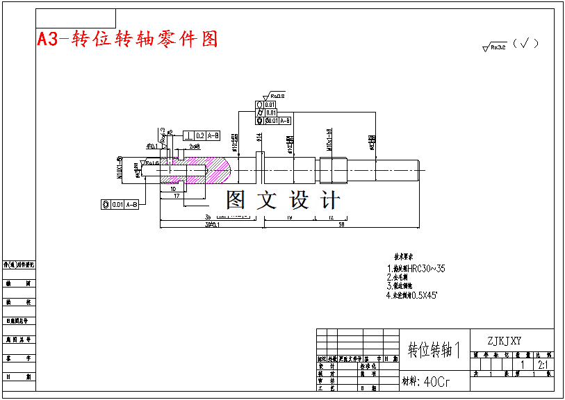 转位转轴零件图。该零件为螺纹轴,通过螺旋副连接两零件,所以要有一定的强度、刚度和韧性。为了提高劳动生产率,保证加工质量,降低劳动强度,需要设计专用夹具,本零件要求设计第六道工序中钻径向孔Φ2的钻床夹具。 本工序的加工要求为:孔径Φ2mm,表面粗糙度为6.3um,与轴左端面距离为40.1mm,径向深度则是与已加工的轴向孔Φ4mm相通,与公共轴线垂直度要求为0.2mm,总体来说精度要求较低。
