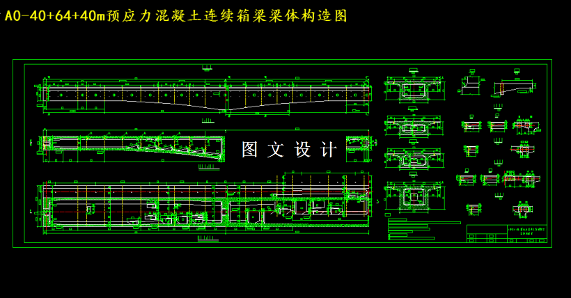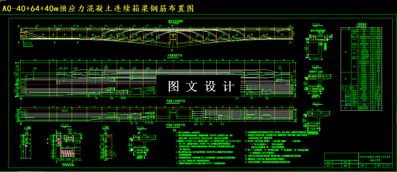 设计主要是对三跨预应力混凝土连续箱梁桥(40+64+40m)的上部结构进行设计。在掌握一定的专业知识,熟练地使用桥梁软件并且能正确地使用规范的基础上,对结构进行合理的设计。本设计采用悬臂浇筑的施工方法,考虑到边跨的刚度以及预应力钢筋数量的影响,边跨按0.625倍的中跨长度取值。利用弯矩的变化规律,本设计线型采用二次抛物线的线型的变高度梁。通过有限元MIDAS建模,模拟结构的受力情况,导出梁的自重内力,二期恒载内力,跨中、支点截面的影响线以及活载内力。利用《桥梁工程》中的相关知识,对结构的预应力钢束进行了估算。其中跨中截面配置39束12φ15.2mm的预应力钢束。墩顶截面顶板束采用36束12φ15.2mm钢束,腹板束采用20束7φ15.2mm的钢束。然后对梁体的T构——双悬臂——连续梁的施工过程进行分阶段模拟,算出了钢束的预应力损失。最后通过对主梁截面抗弯强度,截面抗裂性以及变形的计算,来检算梁体是否满足要求。经过检算梁体符合要求。