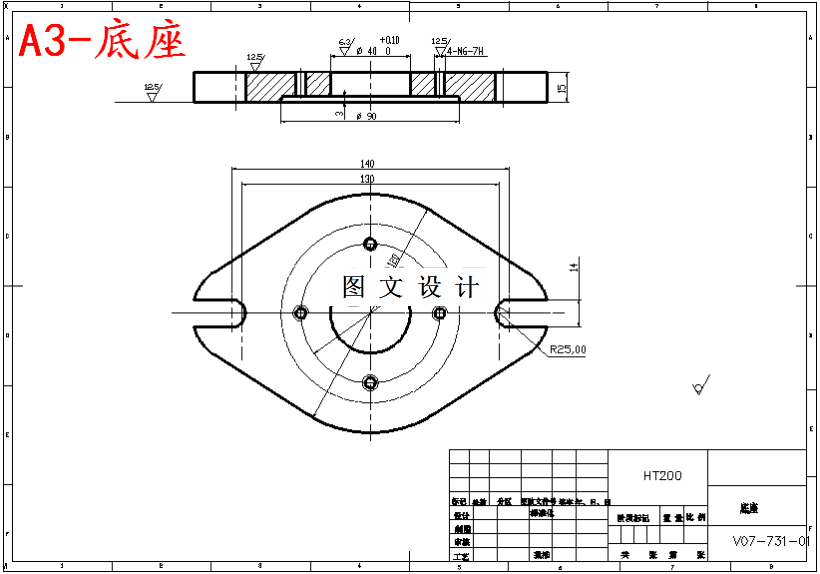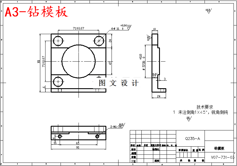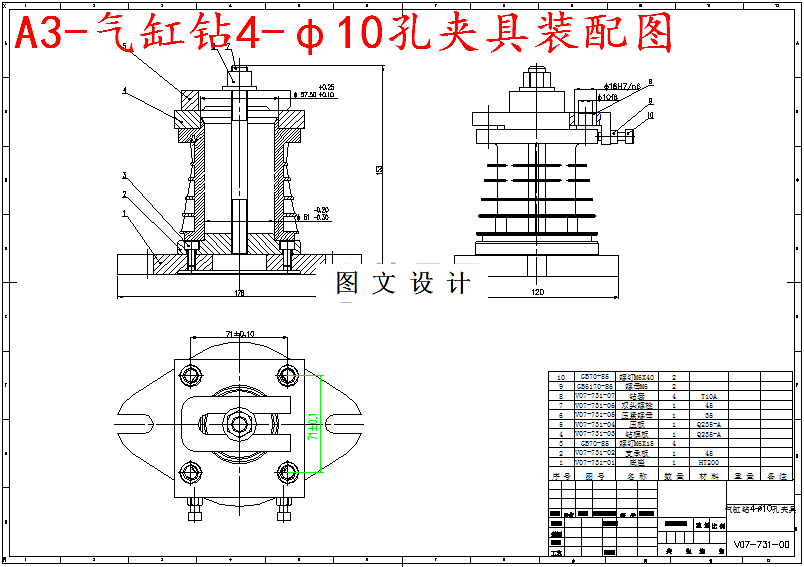 本次夹具设计的主要任务是设计一套钻气缸安装面4-φ10孔钻夹具。钻4-φ10孔的加工工序图。要保证的尺寸有:以气缸内孔中心为基准,孔中心距71(长宽方向),孔的直径为φ10。