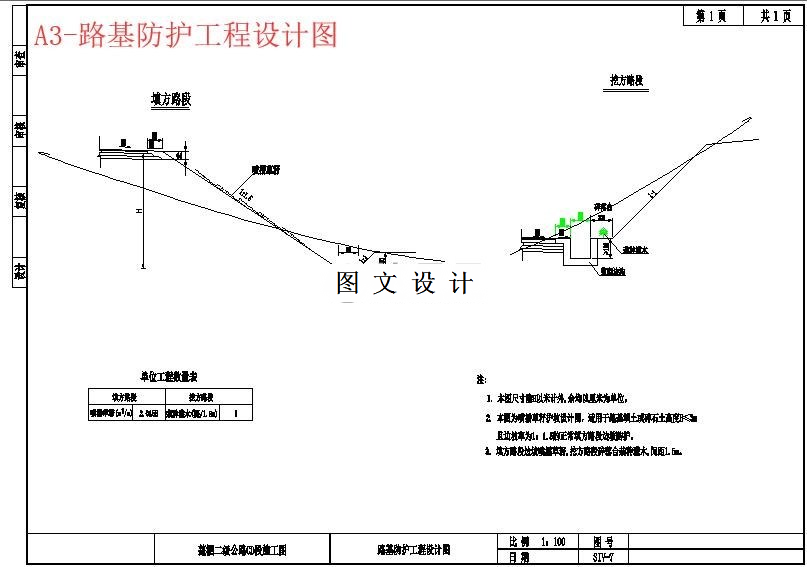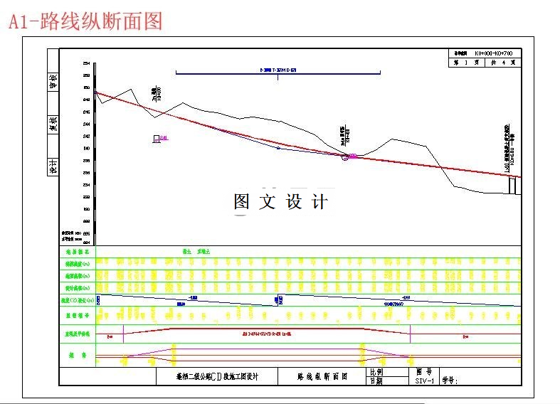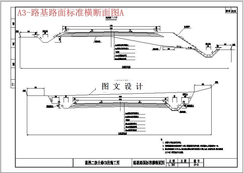 本设计是对蓬栖二级公路CD段的施工图设计。设计内容主要包括公路选线定线、平面线形设计、纵断面设计、横断面设计、路基设计、路面设计、平面交叉设计、桥梁涵洞设计等。选线定线主要是路线方案选优;平面线形设计包括直线以及各类曲线要素的确定,最后得该公路的总长为2724.717m;纵断面设计要求确定竖曲线及其要素、以及涵洞布设位置等;横断面设计包括行车道、硬路肩、土路肩等路面各部分尺寸的确定,以及边沟、排水沟、碎落台、护坡道等结构物的设置;路基设计包括桥梁涵洞设计等;路面设计主要是对沥青混凝土路面的结构的设计,包括采用的路面材料及其厚度等;平面交叉设计主要是标注交叉点的桩号、高程等要素,并简单绘图;涵洞设计要求计算出涵长、孔径等各部分的尺寸,并绘制涵洞设计图。最终的设计成果基本上可以作为路桥施工依据进行施工。