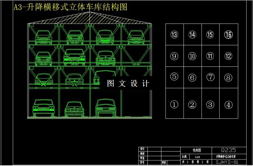 机械式汽车库近年来也在我国一些大城市中兴起,虽然尚存在各种各样的问 题,但经验也正在积累中它具有高效、安全、节省空间等优势,机械式汽车库的 发展将会有广阔的前途。城市化进程的加速,日益增多的汽车带来了城市停车场 不足以及由此引发的一系列问题,已经成为困扰我们的一个社会问题,迫使我们 在城市中紧凑的地域内对停车空间,停车方式进行新的探索。停车库也由地面向 地下,由单层向多高层发展,停车方式亦由坡道式向机械式发展。本文是使用机 械设备作为运送或既运送且停放车辆的汽车库,在一个建筑层里叠置3-4层存放 车辆的汽车库,根据国家相关规定,在确保安全的情况下,使车库切合实际,并 且安全稳定。