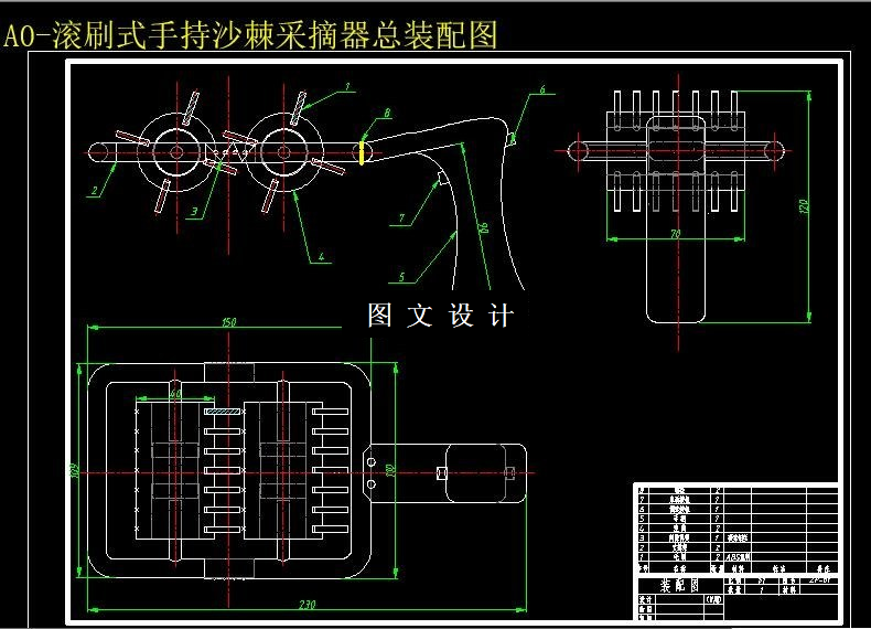 本次设计的产品适用于中国大部分沙棘果的采摘,其目的是为了提高沙棘果实的采摘率和果实的完整率,提高工作效率和降低沙棘果实的损坏率。该设计有3处关键,即采摘头的设计,动力方式的选用和手把的外形设计。其中采摘头设计为滚刷式;动力方式有人力和机械动力两种,经过对比选用机械动力;为了舒适美观将手把的外形设计为枪式手柄。 本次设计采用绘图工具CAD画图和Pro/e进行三维实体造型,使商家与使用者对本次设计的产品有更进一步的认识和了解。