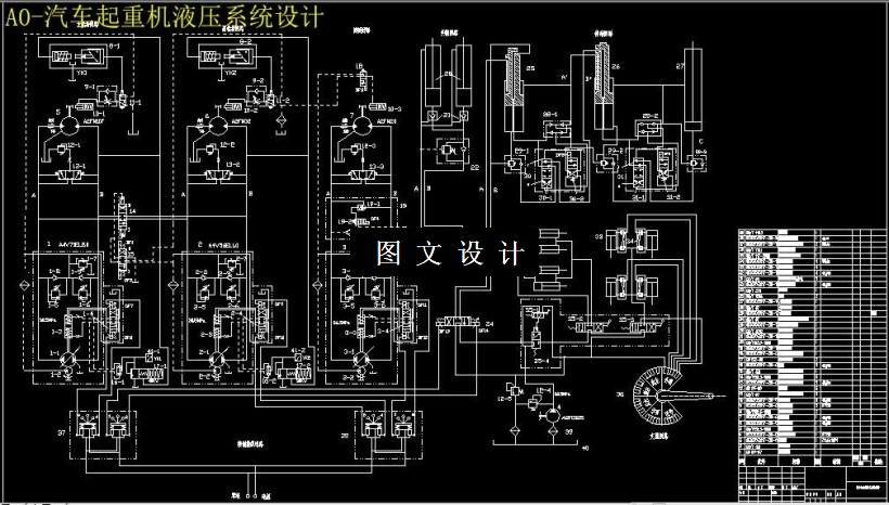汽车起重机液压系统的设计是该型起重机设计过程中最关键的一步。本文根据液压系统的技术指标对该系统进行整体方案设计,对其功能和工作原理进行分析,初步确定了系统各回路的基本结构及主要元件,按照所给机构性能参数和液压性能参数进行元件的选择计算,通过对系统性能的验算和发热校核,以满足该起重机所要达到的要求。 汽车起重机液压系统的起升回路和回转回路进行了改进。在起升回路中采用双泵单马达、分合流油路的开式系统,根据各机构的不同速度和功率的要求,采用不同的液压泵供油,同时可以根据不同的工作方式采用不同的供油系统从而提高工作效率,降低功率损失。在回转系统使用了动态稳定性较好的平衡阀,减少冲击,提高操作精度。对变幅液压缸进行了结构和参数的设计,具体进行了三铰点受力模型的建立和分析,以及对变幅液压缸的稳定性进行校核。本文还针对当前汽车起重机所采用的一项先进技术——电液比例控制技术,从原理、控制部件、回路控制、控制措施以及对汽车起重机的影响等进行专题研究。由此对电液比例控制技术在汽车起重机中的运用给以充分的肯定,对汽车起重机的发展前景有了很大的希望汽车起重机不仅具有移动方便,操作灵活,易于实现不同位置的吊装等优点,而且对其进行驱动和控制的液压系统易于实现改进设计。随着液压传动技术的不断发展,汽车起重机已经成为各起重机生产厂家主要发展对象。