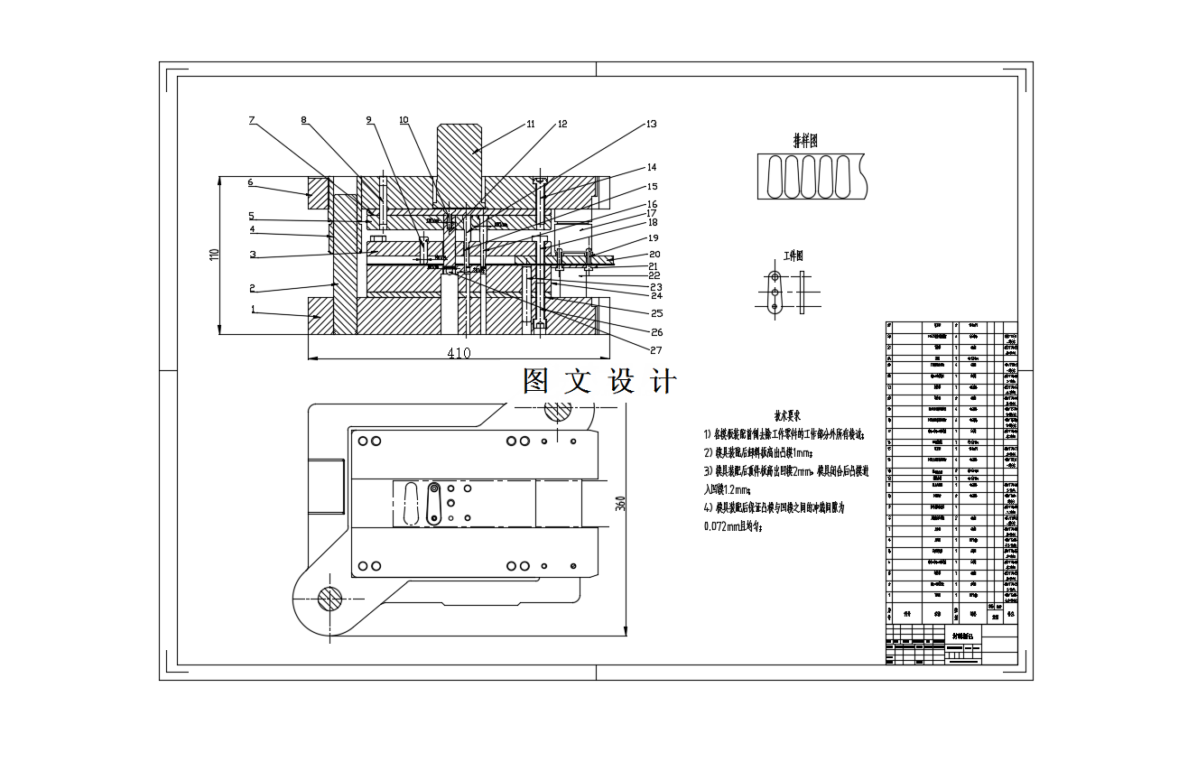 级进模又称多工位级进模、连续模和跳模, 级进模冲压由几个独立的工作站组成,每个工作站对零件执行一个或多个不同的操作。该零件由料带从一个站点运送到另一个站点,并在最终操作中从料带中切出在级进模或转移模中生产零件的决定取决于尺寸、复杂度和生产量。级进模冲压是用来生产大量零件并使成本尽可能低。必须满足精度和耐久性方面的最高要求。本文对给定的带孔冲裁件进行了级进模的设计计算,给出了较好的设计方案。 主要对带孔冲裁件的工艺进行了分析,并根据工件的尺寸精度和技术要求设计计算了冲裁该工件的级进模。