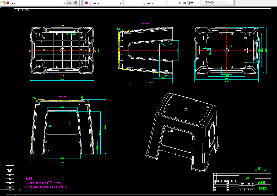 塑料是一种可塑性的合成高分子材料,具有重量轻且坚固,耐化学腐蚀, 电绝缘性好,价格便宜,可塑性好等特点,广泛应用于电脑、手机、汽车、电机、 电器、家电和通讯产品制造中。 注射成形是成形塑件的主要方法之一, 是指使用注射机将热塑性塑料熔体在 高压下注入到模具内经冷却固化获得产品的方法。注射的优点是生产速度快,效 率高,操作可自动化,能成型形状复杂的零件,特别适合大量生产。 本次设计的产品为塑料椅,具有重量轻,强度高,耐腐蚀,易清洁等 特点,为大批量生产产品。本次设计在针对产品进行工艺性分析后,确定模具分 型面、 型腔数目、 浇口形式、 位置大小; 其中最重要的是确定型芯和型腔的结构, 以及它们的定位和紧固方式。此外还进行了脱模机构的设计,合模导向机构的设 计,冷却系统的设计等。最后绘制完整的模具装配总图和主要的模具零件图及编 制成型零部件的制造加工工艺过程卡片。实践证明:该模具结构合理、可靠,并 能保证产品质量,对此类注射产品的模具设计有参考价值。