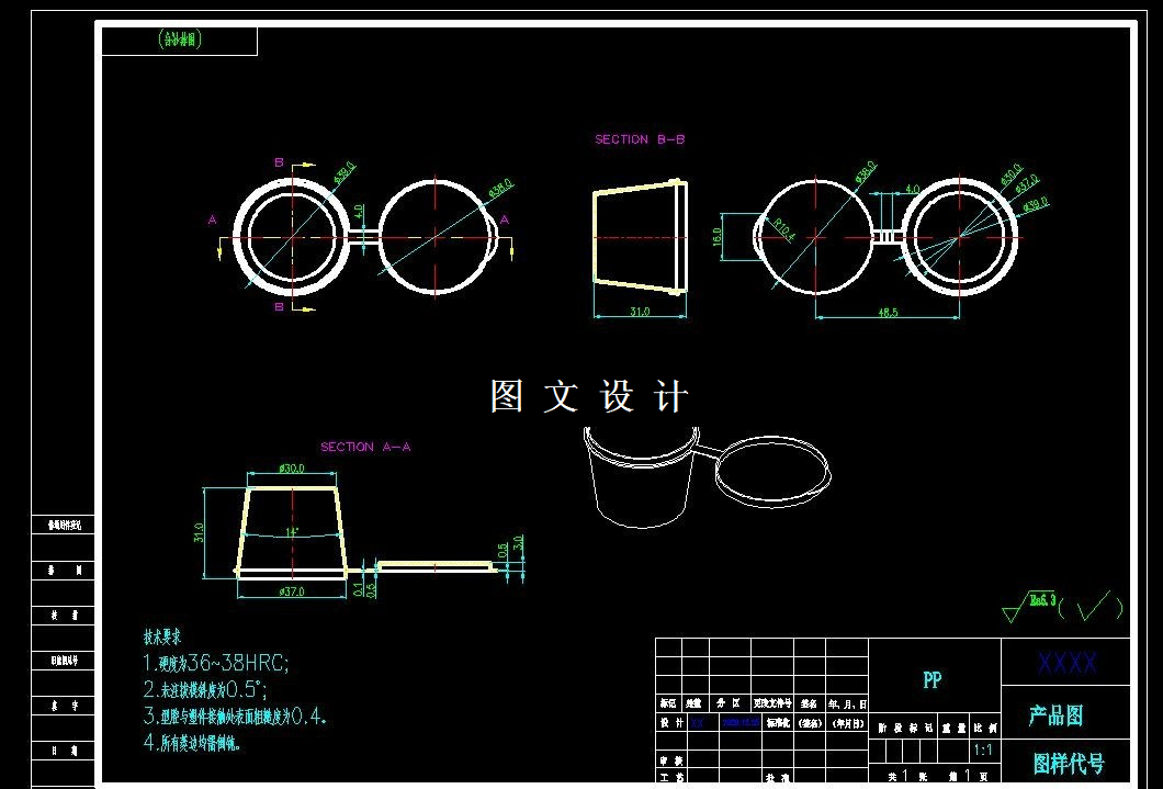 本次设计的产品为带盖调料盒,具有重量轻,强度高,耐腐蚀,易清洁等 特点,为大批量生产产品。本次设计在针对产品进行工艺性分析后,确定模具分 型面、 型腔数目、 浇口形式、 位置大小; 其中最重要的是确定型芯和型腔的结构, 以及它们的定位和紧固方式。此外还进行了脱模机构的设计,合模导向机构的设 计,冷却系统的设计等。
