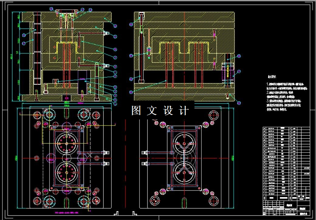 考虑到生产的要求,我们采用一模两腔,点浇口,推杆推出的方案,水路采用的是环形冷却水路,方便加工。根据注射机注射成塑件所用的塑料起量,故此选择注射机为HTF200X。